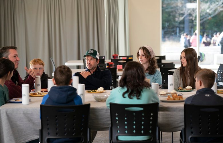 SACO — Days after driving a race car through northern Italy for the upcoming film “Ferrari,” Patrick Dempsey was back in Maine, picking kale and having lunch with local students.