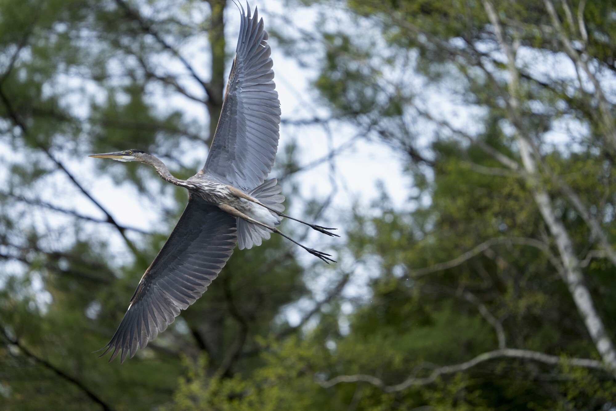 Trees bend toward the river, their roots clinging to the edge where fiddleheads unfurl in dappled sunshine. Swallows dive and skim insects from the shimmering surface. A great blue heron takes flight from the shallows, banking upward to show off its pale belly and full wingspan before heading downriver.