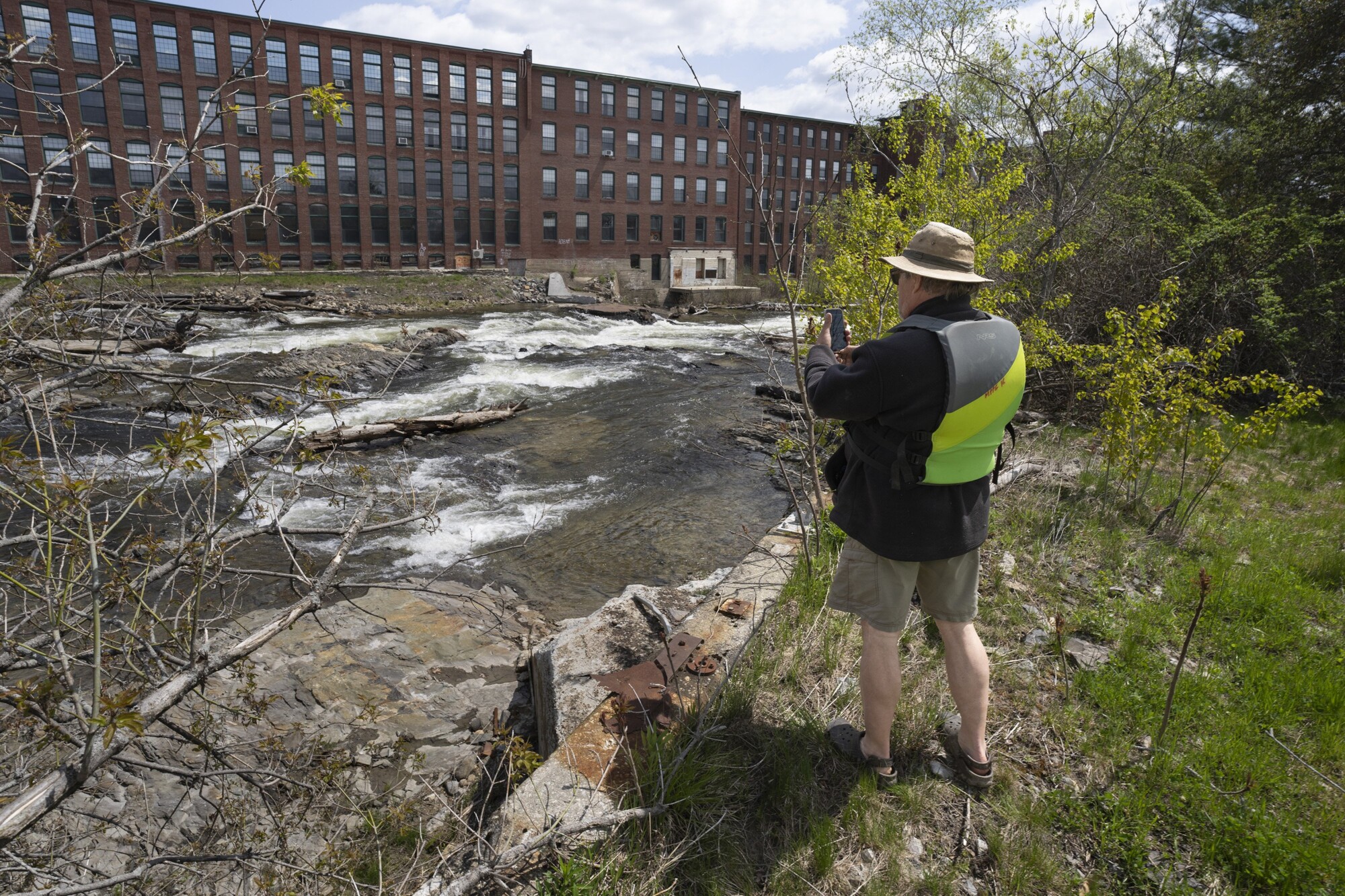 Michael Shaughnessy takes a photo on his phone on May 9 of where the Saccarappa Dam used to span the Presumpscot River in Westbrook. Gregory Rec/Staff Photographer