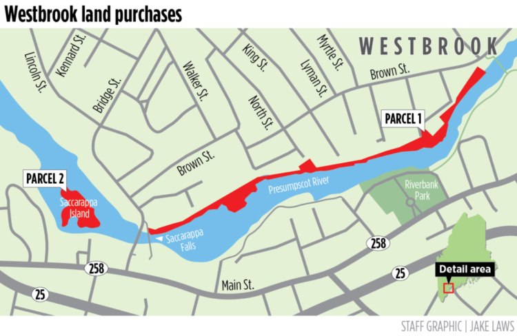 In April, the city purchased 1.7-acre Saccarappa Island and a narrow 3.7-acre parcel that extends 3,500 feet along the river’s northern shore, from the Bridge Street bridge to the railroad bridge. The land deal with Sappi North America, which operates a paper mill further downriver, included a 980-foot trail easement along the river’s southern shore.