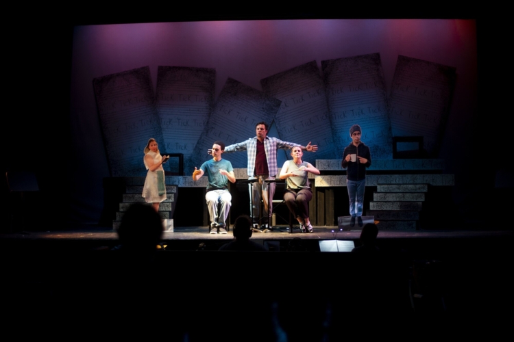 From left, Joshua Clements, Jacob Zentis and Lindsay Andrews during a rehearsal for “Tick, Tick…Boom” at Hackmatack Playhouse in Berwick. Derek Davis/Staff Photographer