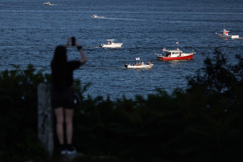 Darling, Paul and another of Fahrman’s fans, Cindy Young of Old Orchard Beach, stood on the highest block of the lighthouse foundation as the boats passed by. They held their arms above their heads in the shape of a heart during the procession.