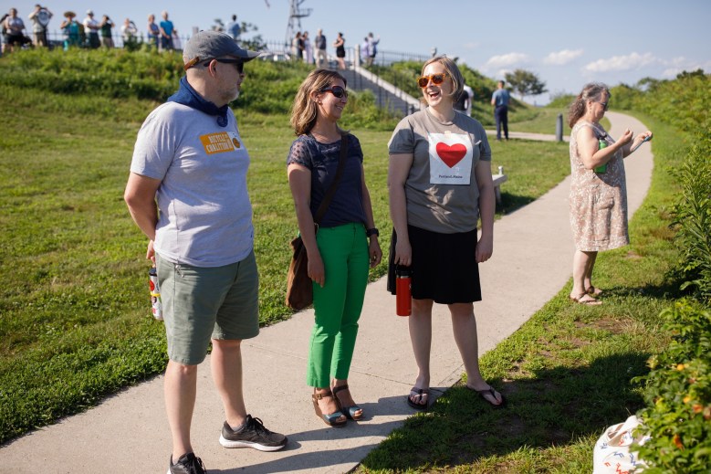 One of those people was Annie Darling of Cape Elizabeth, who brought her friend, Maggie Paul of Santa Cruz, California, to the granite steps of Bug Light, the 1875 lighthouse that the South Portland park is named after. Several dozen people watched the parade from the park.