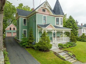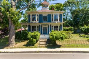 Tucked a block away from Main Street, this 1890 Queen Anne with wraparound porch includes a seamless two-story addition in the rear and a newer two-car, two-story garage. The renovated kitchen is modern farmhouse style, with a sash sink, teal bead board island and butler’s pantry with a second dishwasher and sink. An extravagantly carved original mantle surrounds a gas fireplace insert. Primary suite has a walk-in closet and modern bathroom, and there’s a third-floor office. Listed by Jeri Holm, Camden Real Estate Company. See the full listing.