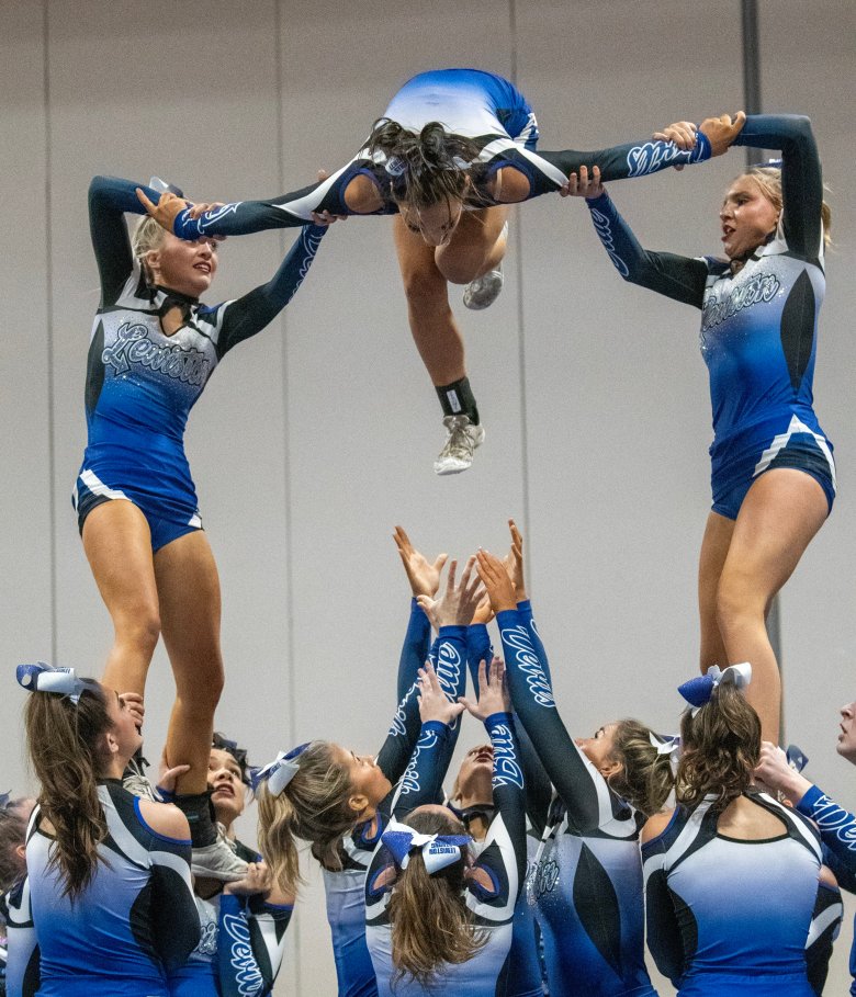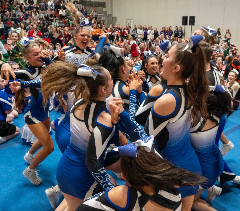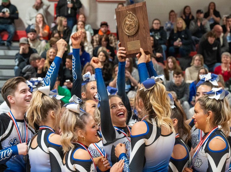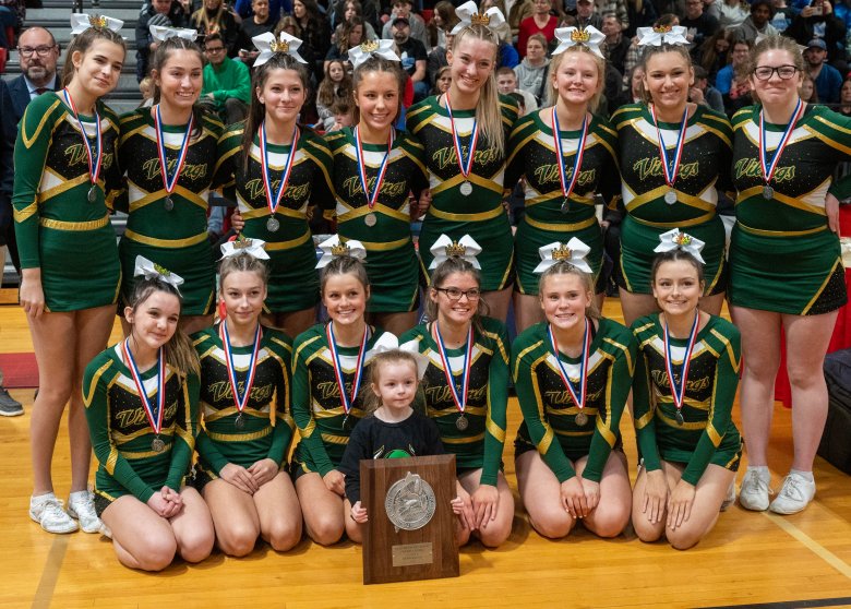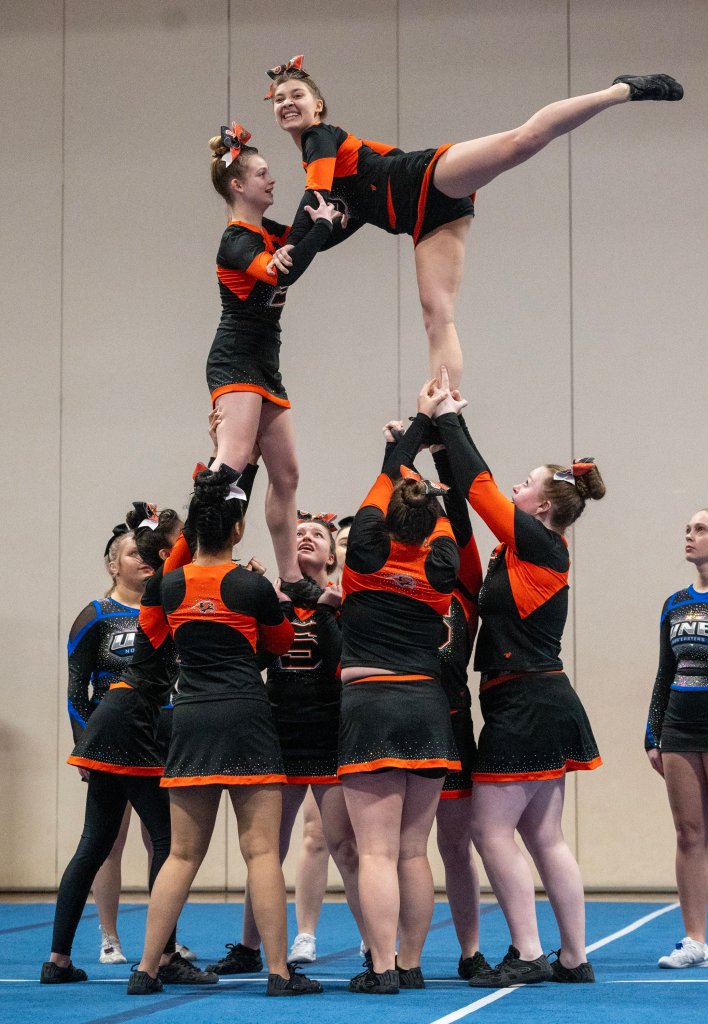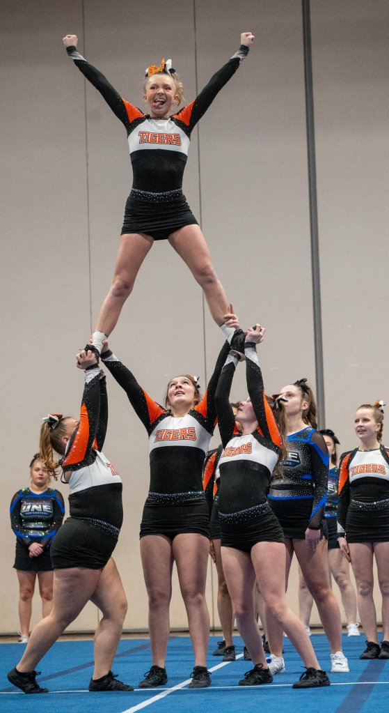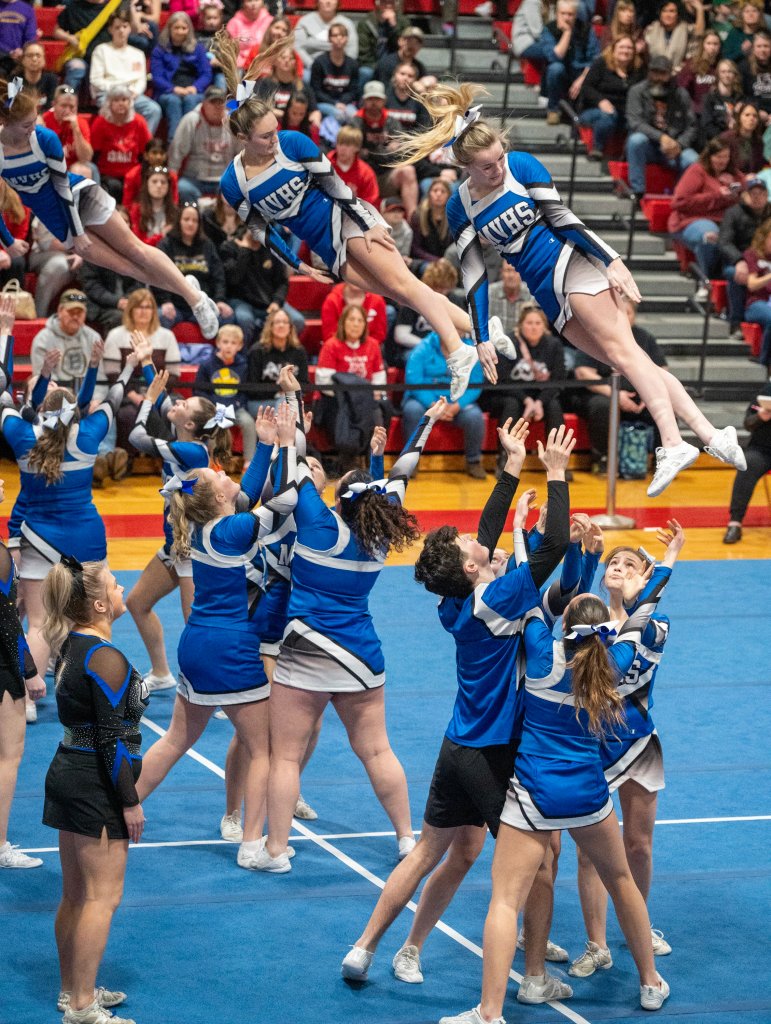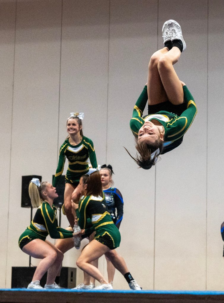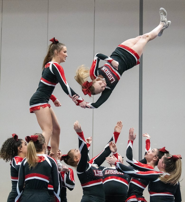 “We worked so hard, and it feels amazing,” Lisbon junior captain Riley Hoyle said of her team’s first-place triumph. “We had to change everything because we lost one of our flyers, so it was a very stressful two weeks since MVCs (Mountain Valley Conference championships). … That just makes it so rewarding. I’m so proud of my team.”