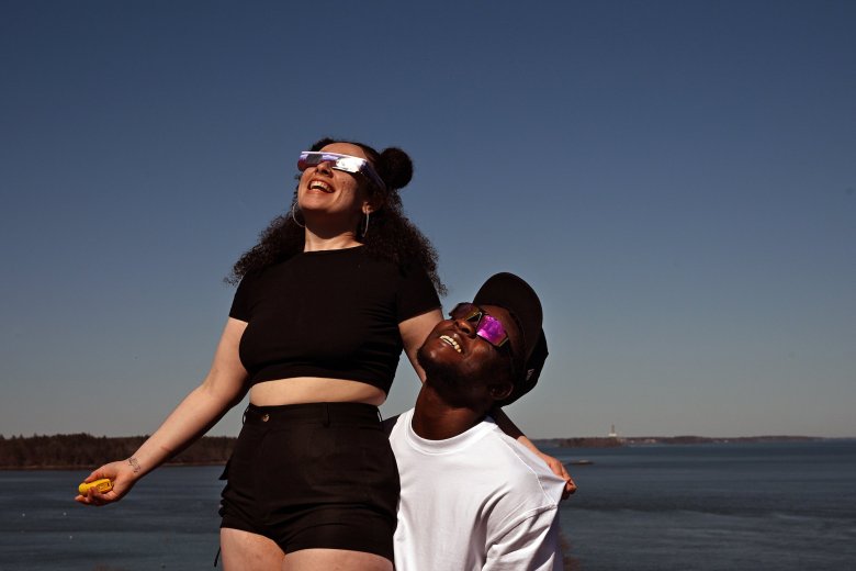 Elsewhere in South Portland, Liz Carlson, 45, stood in her front yard wearing eclipse glasses, face turned to the sky. She works from home for a health insurance company and took a few minutes off to observe.