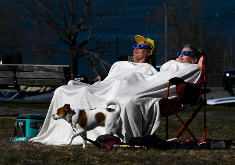 Sam Lasher and Mary Macaluso, both of Westbrook, watch the eclipse from the Eastern Prom with their dog Ellis on Monday. Shawn Patrick Ouellette/Staff Photographer