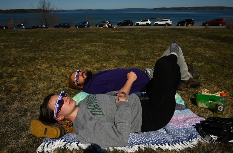 In South Portland, hundreds gathered at Bug Light Park to watch the eclipse from the wide open field at the edge of Casco Bay. Some arrived early, picnicking, playing ball or flying kites before the celestial event.