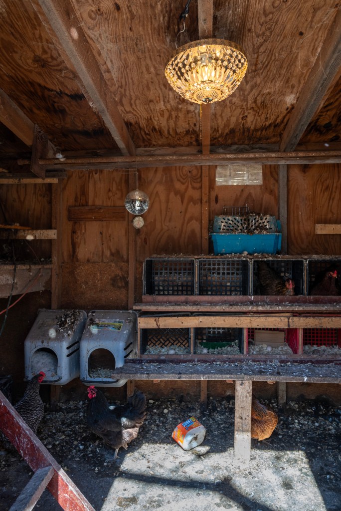 The chickens lead equally embellished lives. One co0p that came with the property is befitted with a sparkling chandelier that Swindells brought home for the nesting fowl. On the outside of the structure is a doll house that he nailed to the wall with rooms converted to provide additional space for egg laying and general revelry. The cherry on top is the disco balls scattered throughout the yard — because the hens are always down to party, sure, but mainly to scare away winged predators such as hawks that circle the area.