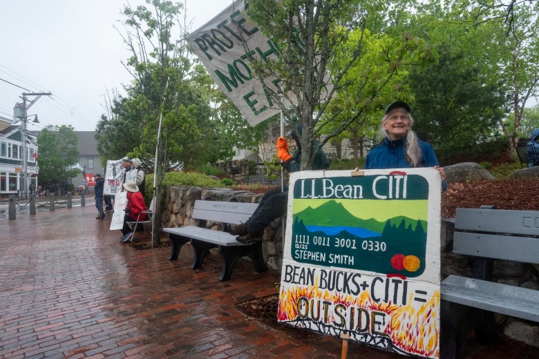 Parked in front of the flagship store in downtown Freeport, Bill Rixon and other demonstrators held signs protesting the company’s links to fossil fuel companies through its Mastercard provider, CitiBank. The group, which frequently protests the company, aims to press L.L. Bean to divest from companies connected to fossil fuels.