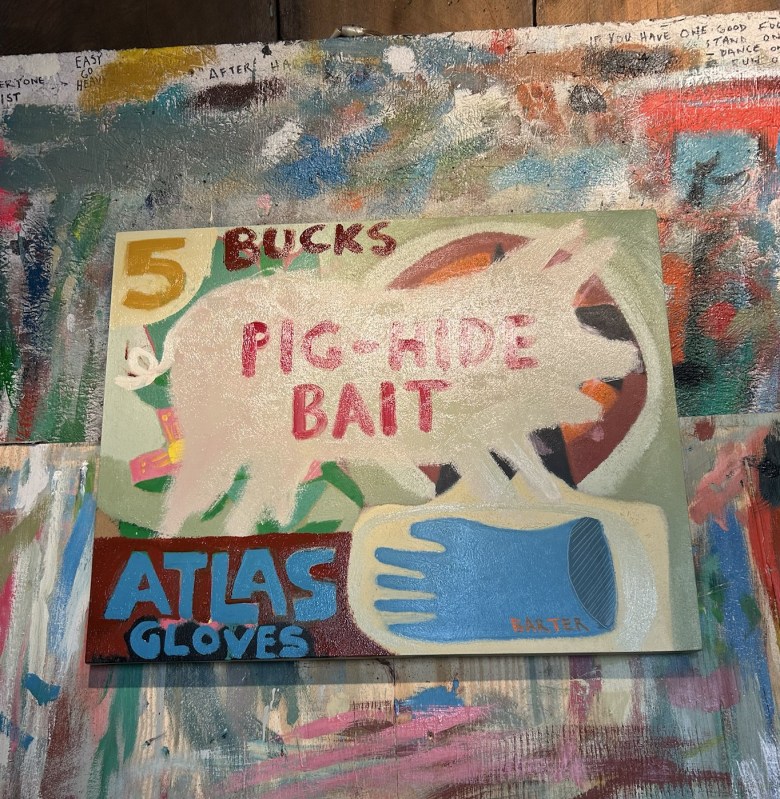 “Fishermen know, through experience, the environment is changing,” Barter said. “And they’re crafty; you have to be when you’re on a boat. This new painting, about the recent shift toward pig hide bait, raises questions about how their solutions might impact the seas down the line.”
