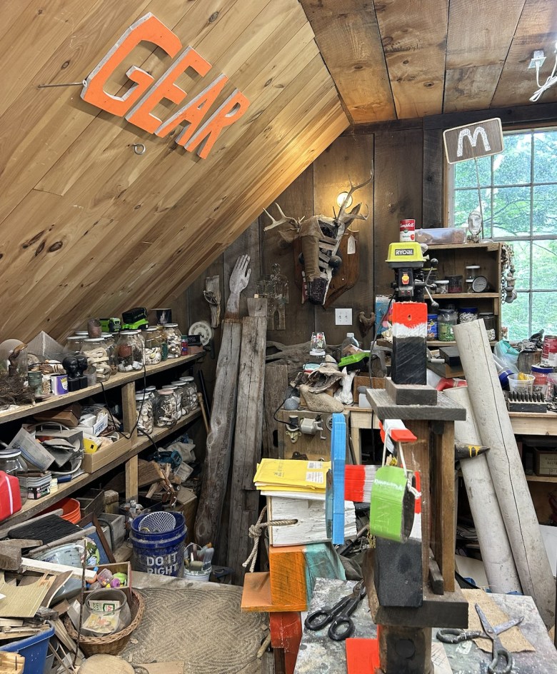 As indicated by Barter’s bricolage technique — reusing objects like barn beams, driftwood, burlap and rope to create new meanings — much of his creative process is intuitive. Even the abstract faces, a signature of his work, result from experimentation.