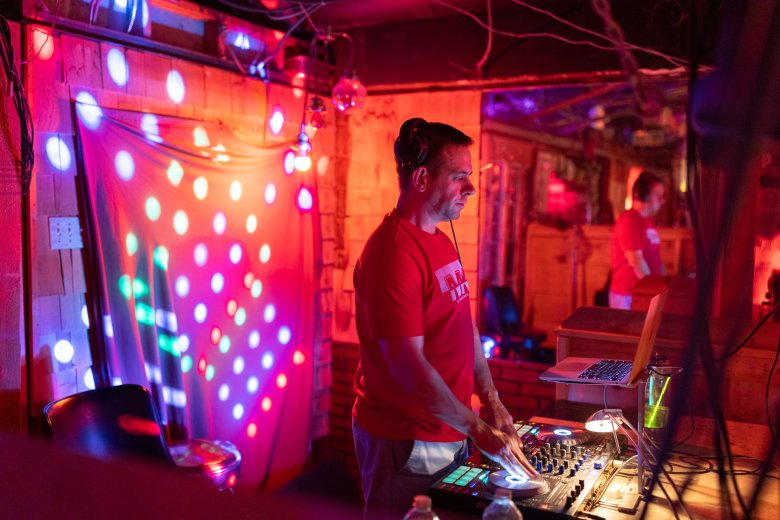 The first person to hit the dance floor is Bart, who didn’t want to give his last name to maintain his privacy. He has about 40 glow sticks stuffed into his shirt pocket and closes his eyes as he dances alone, slowly unfurling his limbs in all directions and twisting his hips, bending deep into his knees. Periodically he pauses to decorate himself with the glow sticks, looping them through his shoelaces and the buttonholes of his shirt so he glows from head to toe.