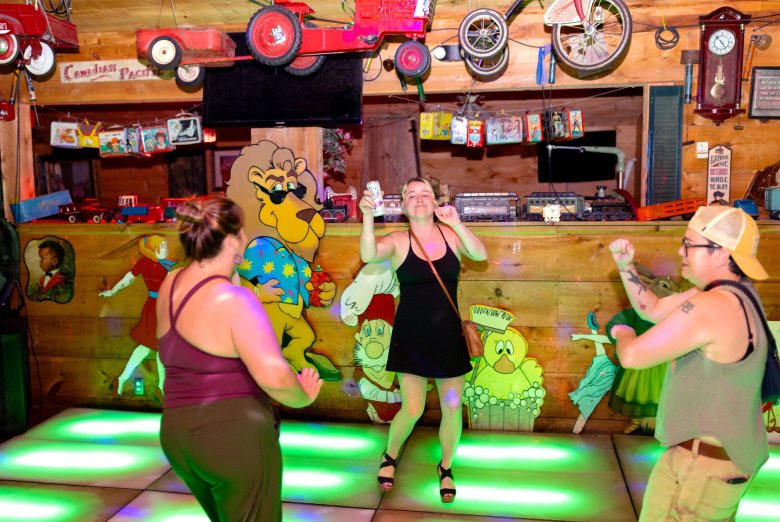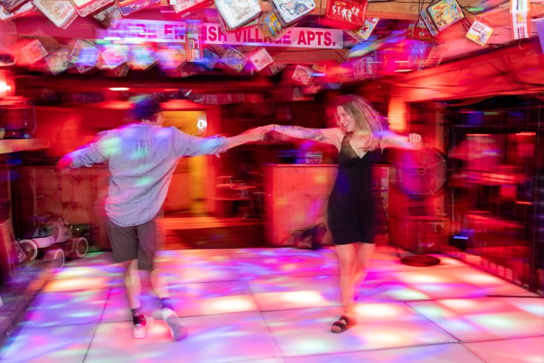 Inside, the flashing rainbow lights from the three dance floors set the whole place aglow. Colorful vintage lunchboxes hang from the ceiling. Broken-down office chairs are pulled up to the bar. A taxidermy raccoon sits in a corner. Old ovens are lined up in a row along the wall.