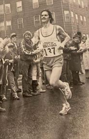From 1975 to 1982, Kenny dominated the Maine road racing scene with countless wins and records. Many good and even great runners considered Kenny to be the standard for distance running excellence in Maine. Lots of runners in Maine would purposefully go to the Olympia Store in the Maine Mall where Kenny worked in management to be fitted to new running shoes by him and get his expert running advice. For a time in the late 1980s, Kenny had his own weekly newspaper column in the Maine Sunday Telegram where he offered running and training advice. In 1978, in perhaps his greatest race, Kenny led number one World Ranked runner Bill Rodgers for over 4-miles in the 7-mile Heartbreak Hill Road Race in Boston before finishing in second place. Kenny also was the proud seven-time winner of the annual Portland Boy’s Club 5 Mile Race where he routinely ran at or just under 24 minutes flat for five miles.