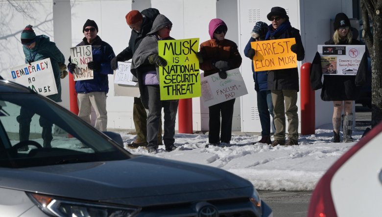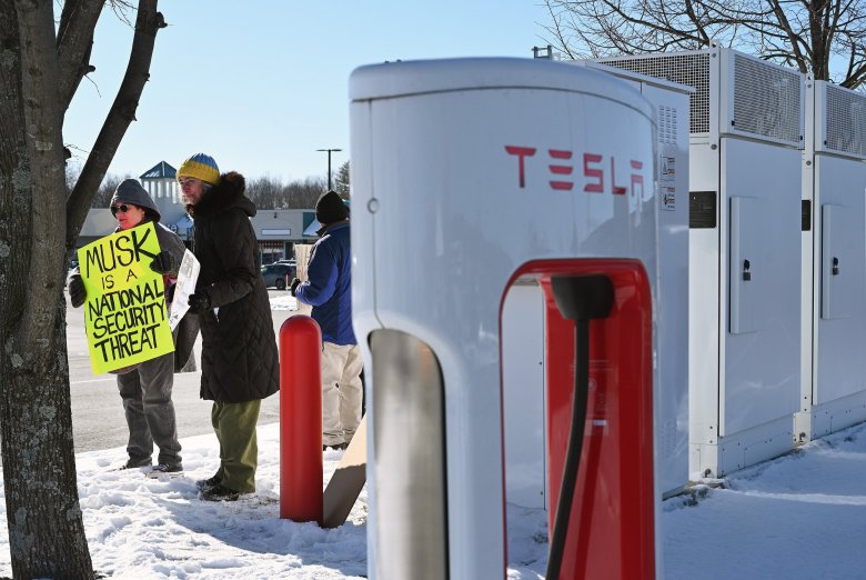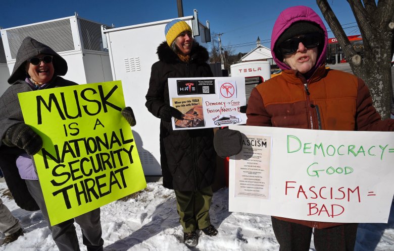 The protesters, set up next to a Tesla charging station at the entrance to Elm Plaza off Main Street, carried signs with messages including “Democracy, not Dictators,” and “Arrest Musk.”