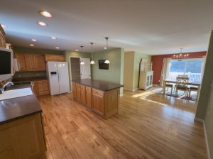 • New appliances in the designer kitchen with pantry closet, oak cabinets and island