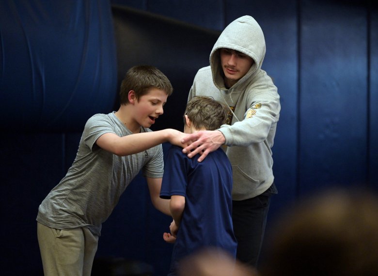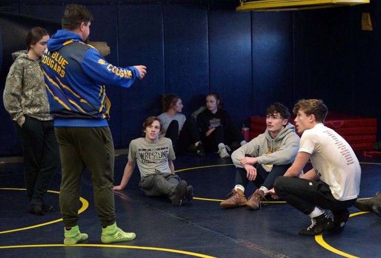 But behind those doors, the room is buzzing. It’s lined wall to wall with blue wrestling mats. Names of wrestlers from years past adorn yellow signs along the wall. A giant blue spotlight rests in the corner, painted yellow with the names of previous state champions. Male and female grapplers are jumping from drill to drill, absorbing a quick tutorial from third-year coach Mike Hansen before getting to work. Rap music plays loudly in the background.