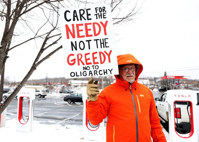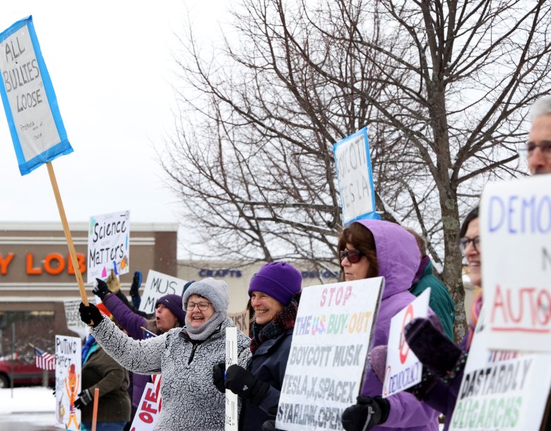 WATERVILLE — They held signs that read “Cut Waste, Cut Fraud, Cut Musk,” “Musk Must Go!” and “Deport Musk, Fire Dastardly Oligarchs Grifting Everything.”