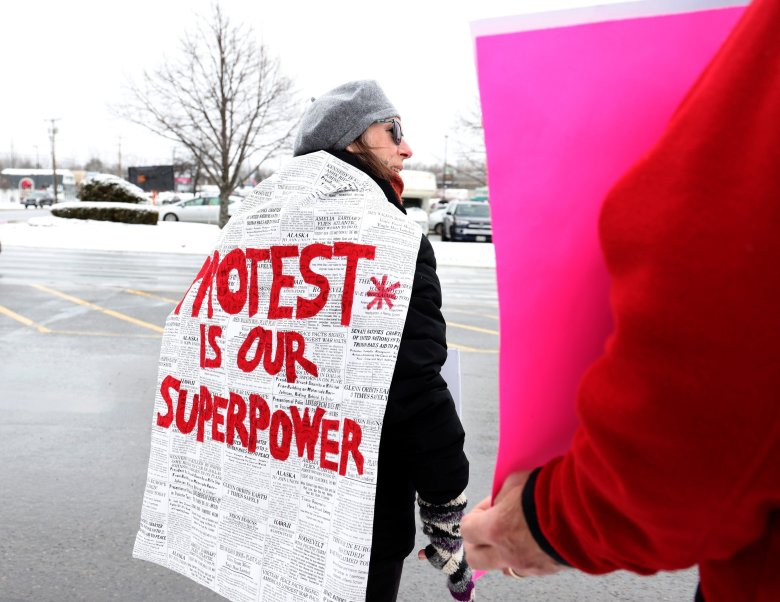 More than 60 men and women from around central Maine stood Saturday in 30-degree temperatures and about 3 inches of snow that had fallen overnight at the Tesla charging station off Main Street. They greeted motorists at the busy intersection who honked horns and gave the protesters a thumbs up. At least one man, driving a pickup truck, gave them the finger and yelled.