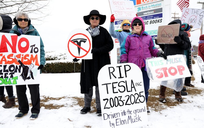 The demonstration was one of hundreds held worldwide Saturday as part of “Tesla Takedown,” a planned, peaceful event organizers say is intended to highlight President Donald Trump and Tesla CEO Elon Musk’s gutting of democracy. The protesters criticized Musk’s firing of thousands of federal workers, decimating departments, eliminating agencies and his public demonstration of what he called a fascist salute.