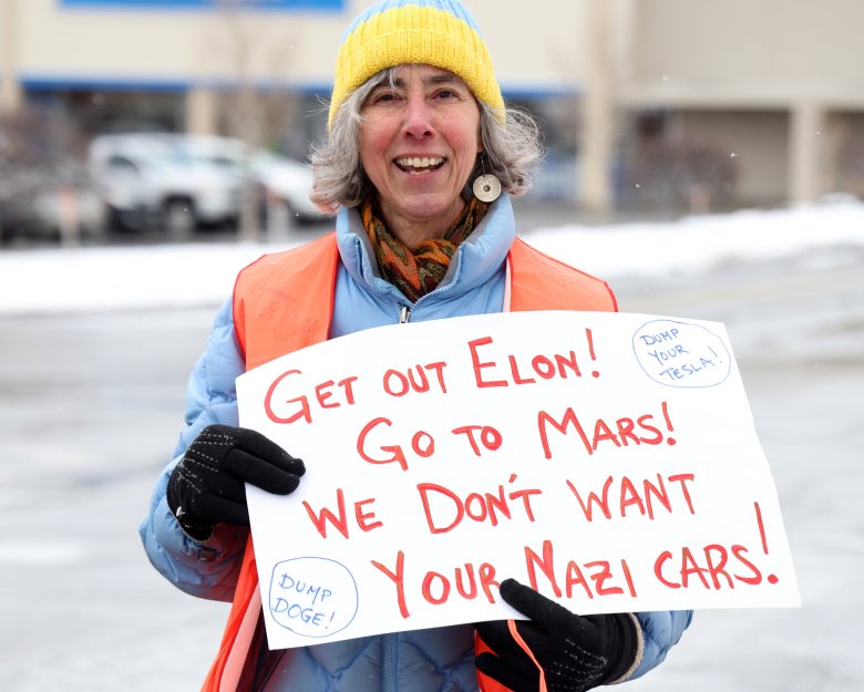 The site of Saturday’s protest, the Tesla charging station, was where the first known Tesla-related protest was held Feb. 5. Elizabeth Leonard, author, historian and professor emeritus of history at Colby College in Waterville, organized that event, which went viral on both social media and in the news after the Morning Sentinel published a story about it. After the protest, demonstrations were held at Tesla dealerships all over the country and world and Leonard was interviewed by several news organizations.