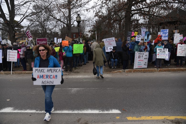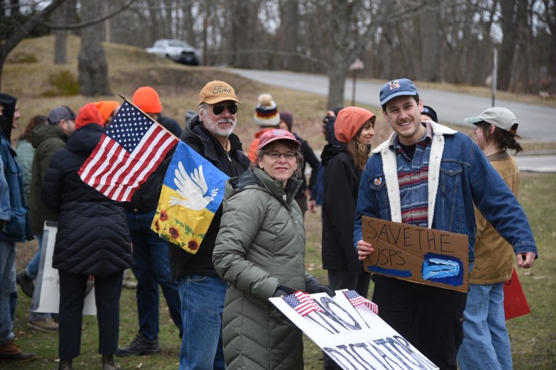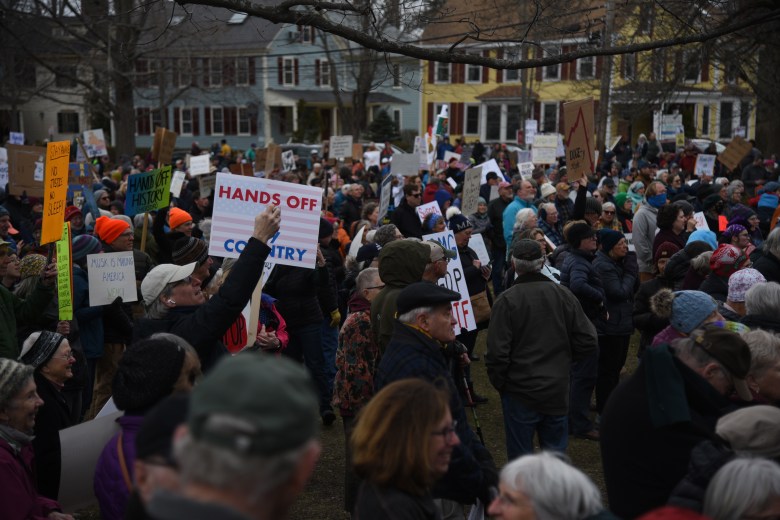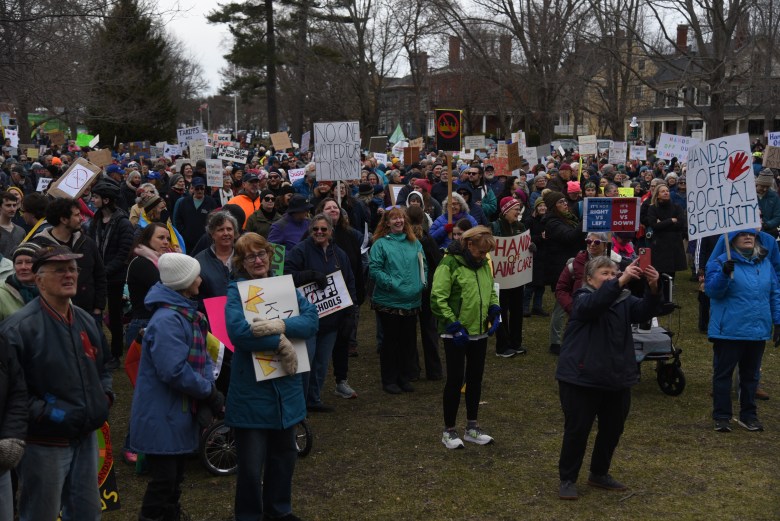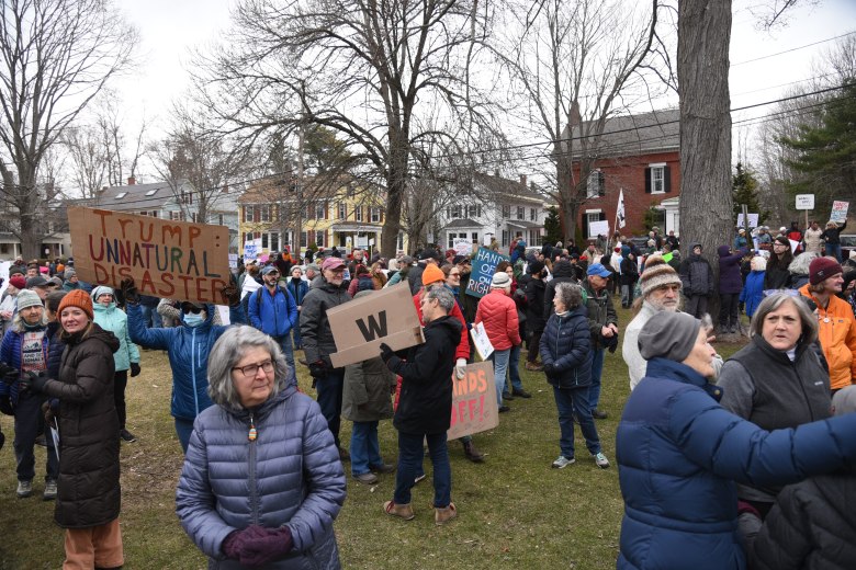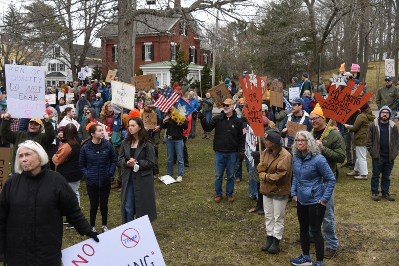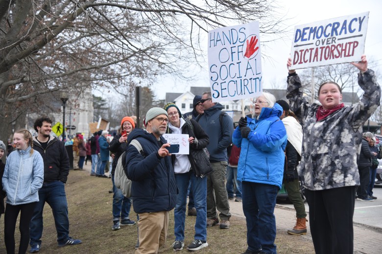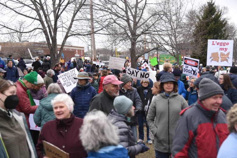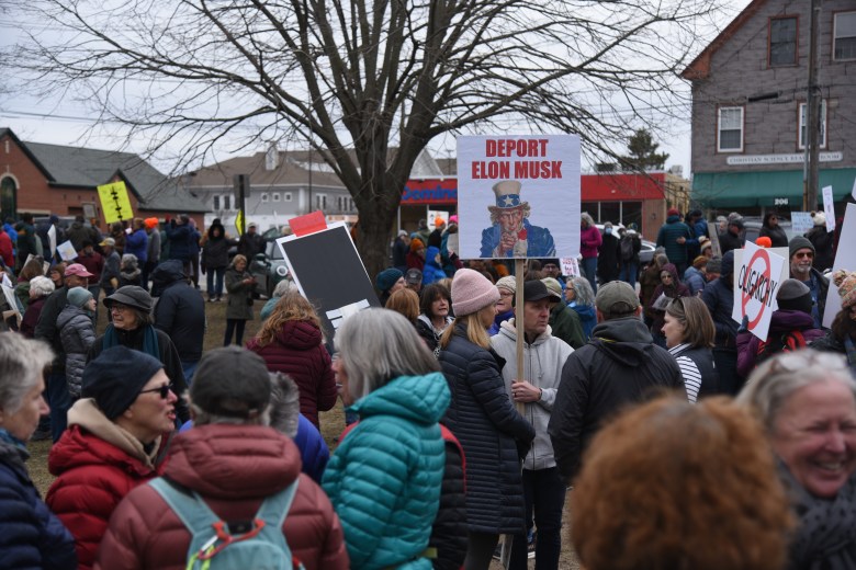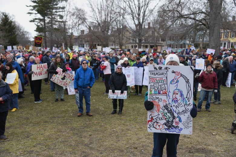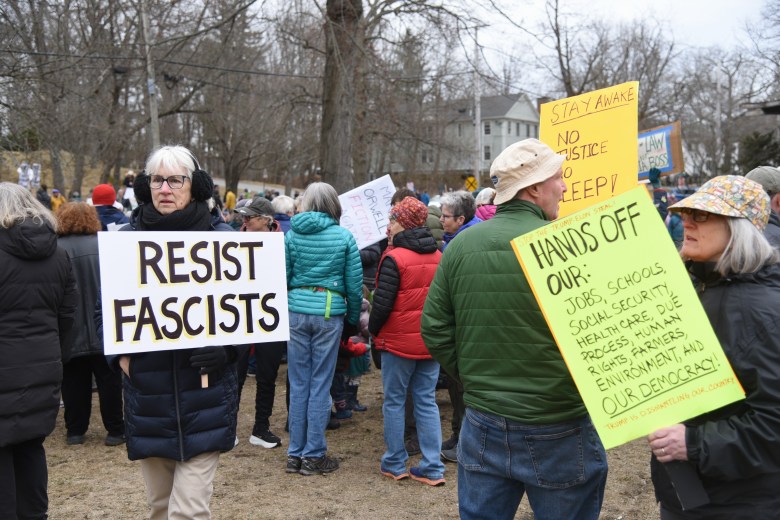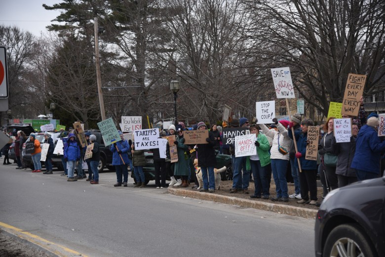 The Maine “Hands Off!” rally in Brunswick was among thousands of similar demonstrations held across the country. Protesters carried signs supporting the federal workforce, decrying Elon Musk and his Department of Government Efficiency, and more.