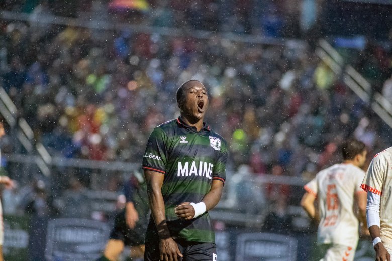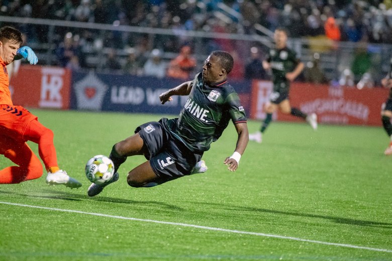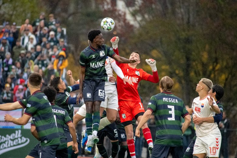 Moments after One Knoxville SC’s Mikkel Goling went crashing into the advertising side board alongside the Highrollers Section field side seats — and appeared to get a message from from Maine Gov. Janet Mills — the Hearts of Pine struck for the franchise’s first goal at Fitzpatrick Stadium.