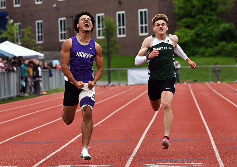 Clark won the 100 in 10.70 seconds (which was Maine’s all-time best before he came along). He also anchored the Hawks’ 400 relay team that included Landin Napolitano, Isaiah Perodin and Macaiah Perodin to a meet-record time of 42.93 seconds, then finished his day with his a meet record of 21.69 seconds in the 200. Clark caught and passed Bonny Eagle sophomore Drew Gervais, whose time of 21.91 was also below the previous meet record of 21.96 set in 2021 by Aidan Walcott of Bonny Eagle.