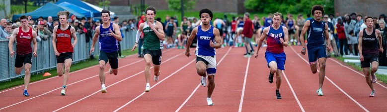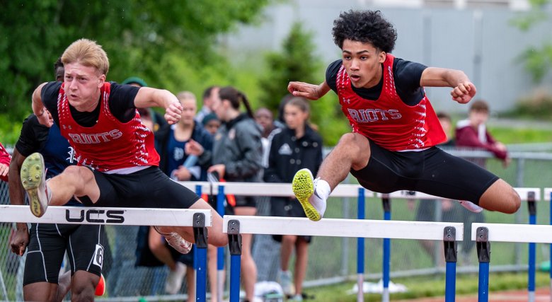 In the boys 300 hurdles, Arnaud Sioho of South Portland was hindered by an injury and was unable to repeat as champion. Sioho, who suspects he has a sports hernia, had competed in only three meets this season. Gorham sophomore Antoine Dube was in position to take advantage, challenging Sioho all the way down the home stretch and then getting the edge when Sioho clipped a hurdle.