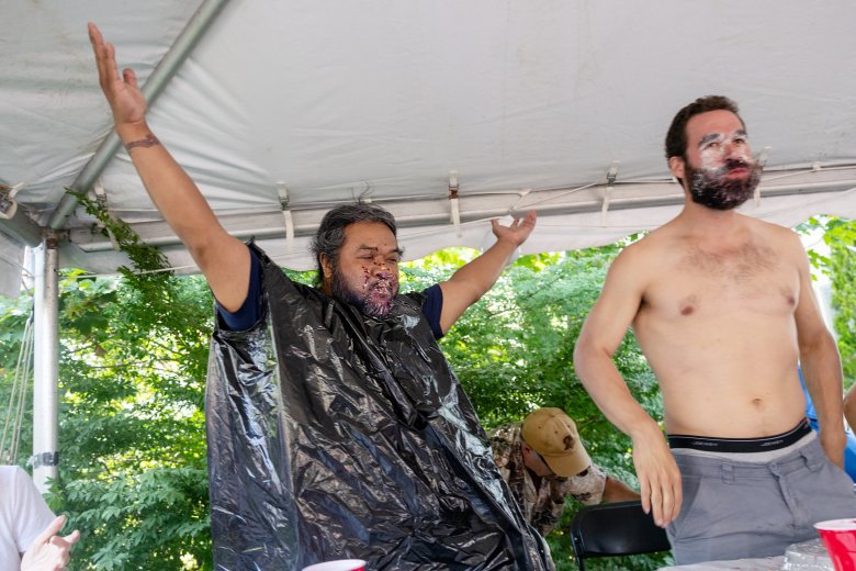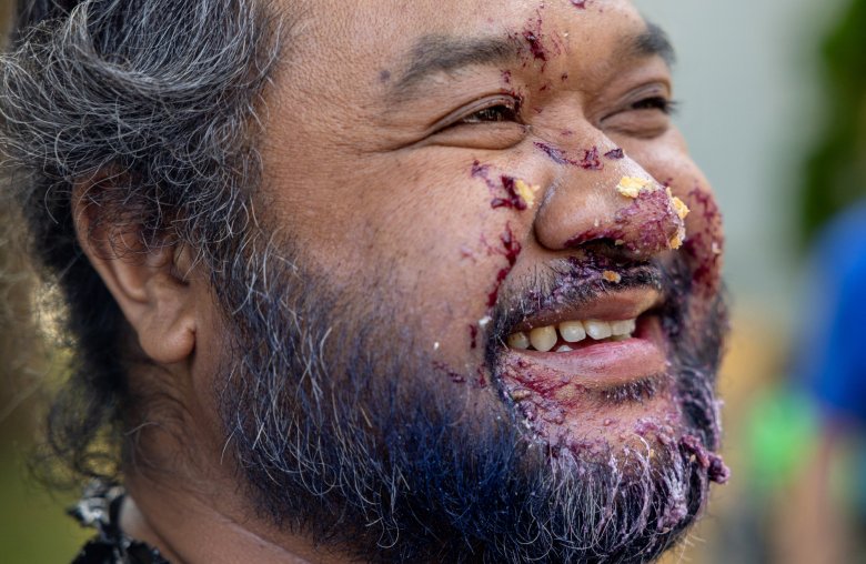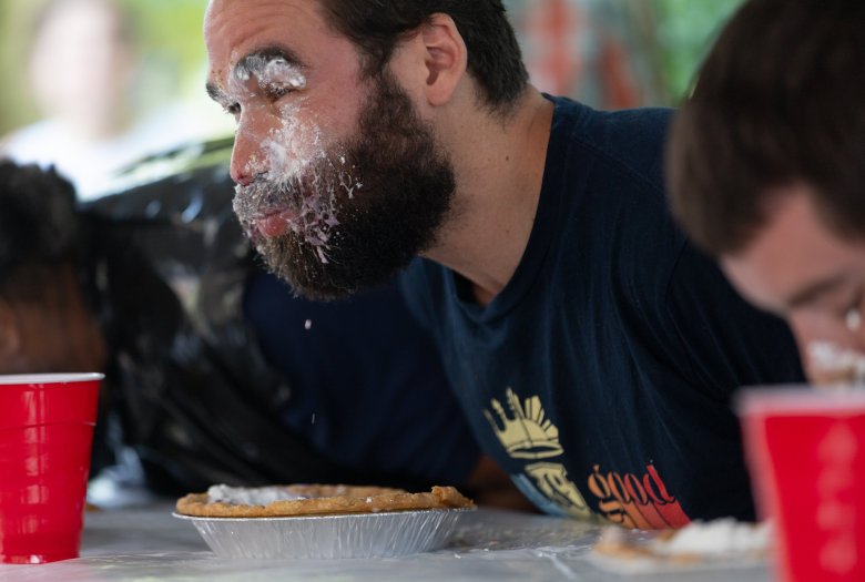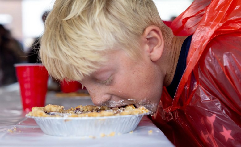 First-timer Wilson Rith was victorious in the blueberry pie eating contest, smiling through a face full of pie.