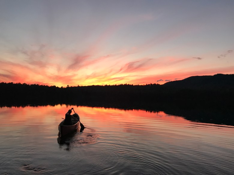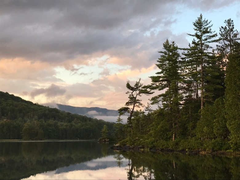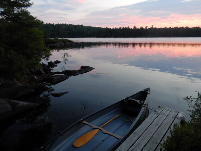 Meals at camp are simple affairs. Tonight, it’s cheeseburgers on the tabletop grill, garden salad, and store-bought macaroni salad. There are steaks, corn-on-the-cob, canned beans and eggs and bacon in the larder; we won’t go hungry. At sundown, the sky turns pink and purple, and we take a nightcap to the rocky point and drink it in, mosquitoes and all.