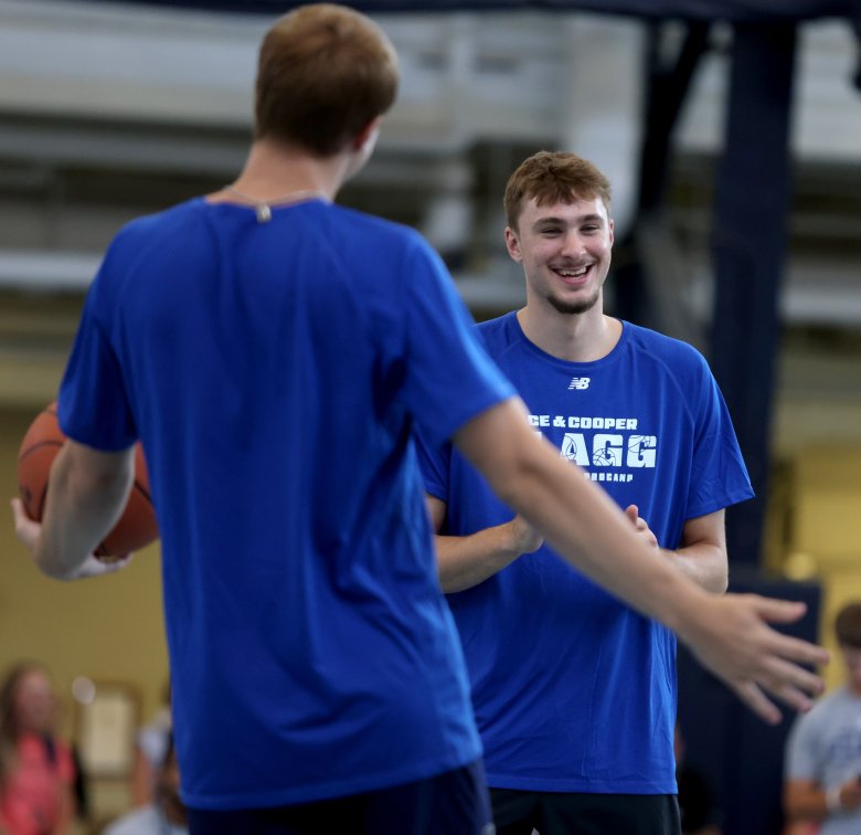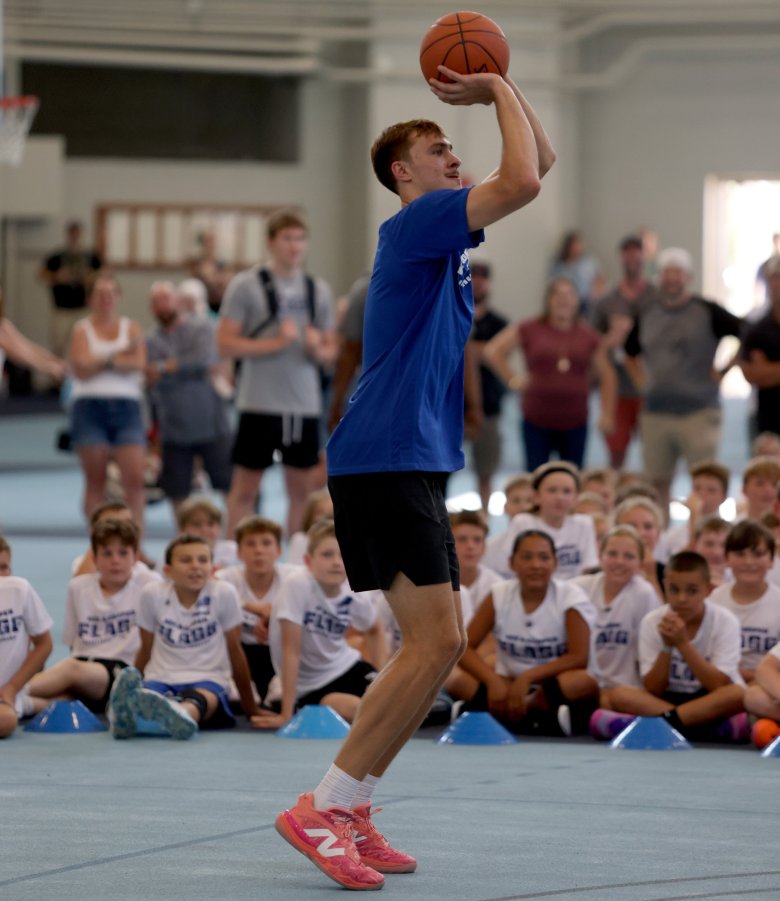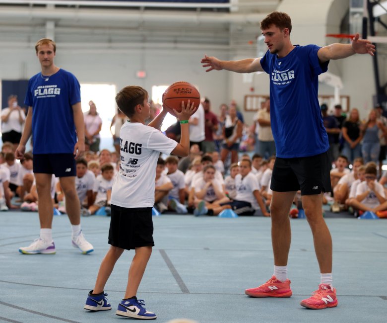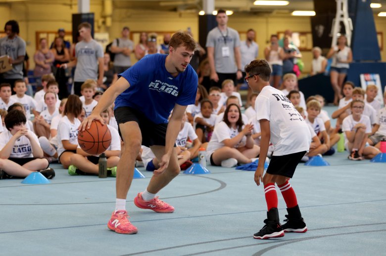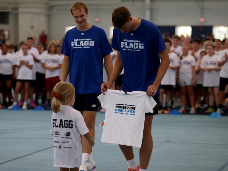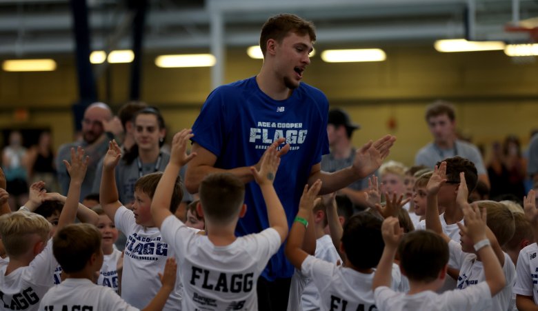 Flagg spoke alongside his twin brother, Ace, during an afternoon session of the Cooper and Ace Flagg ProCamp at the University of Maine, marking the second year they’ve run the camp for kids together. He spoke hours after he and his brother dazzled the campers in 2-on-2 games, taking the opportunity to throw down the types of dunks, alley-oops and athletic finishes for which he’s become known around the world.