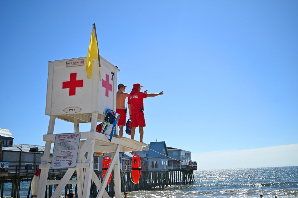 Old Orchard Beach lifeguards Brodie Berlinger, left, and Nate Underwood watch swimmers from the lifeguard stand Thursday. The yellow flag indicates medium hazard, with moderate surf and/or currents present. (Shawn Patrick Ouellette/Staff Photographer)