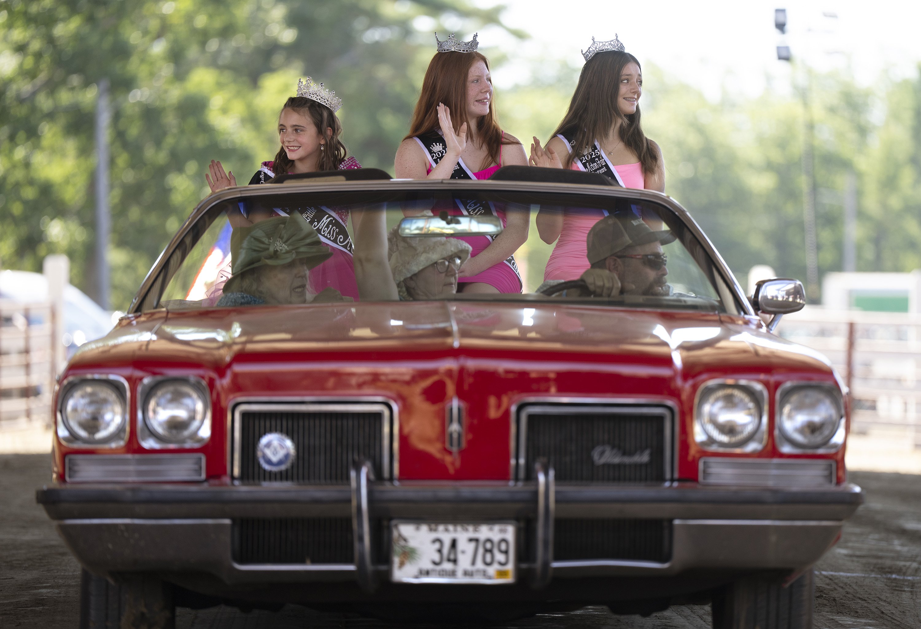 Autumn Grenier, 8, left, Adelaide McArthur and Emma Robishaw wave to the crowd as they are driven Saturday through the grandstand at the Acton Fair during the grand parade. On Friday night, Grenier was crowned Little Miss Acton Fair, McAthur Junior Miss Acton Fair and Robishaw Miss Acton Fair.