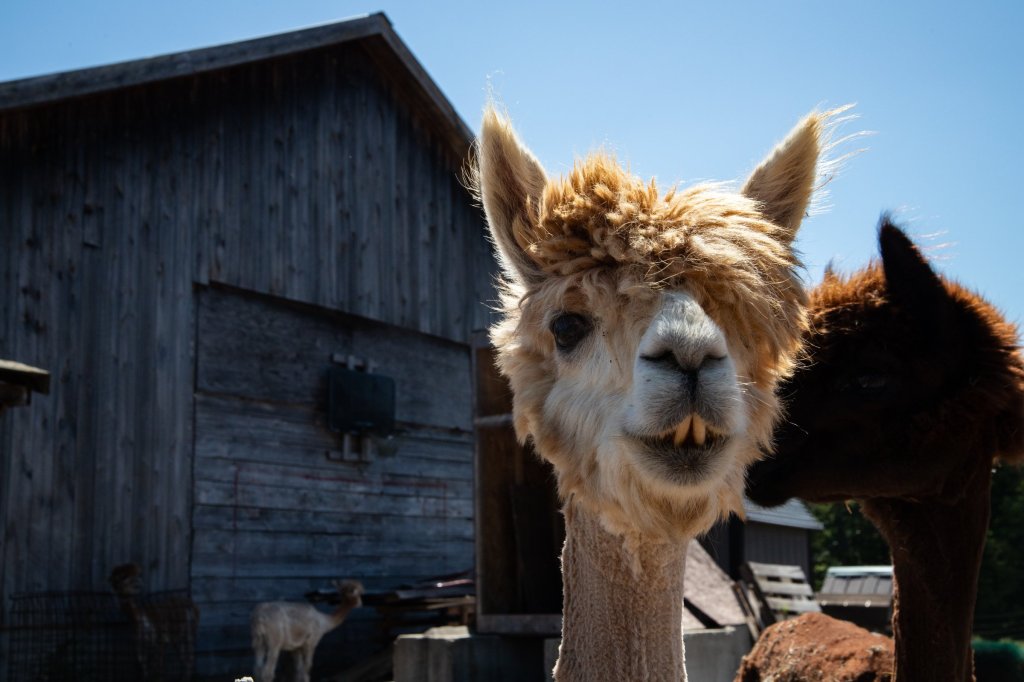 Curious alpacas look on from their enclosure Aug. 21 at Nezinscot Farm in Turner. Their coats are cut and the fibers are spun into skeins of natural wool sold on the upper level of the Nezinscot farm store. (Libby Kamrowski Kenny/Staff Photographer)