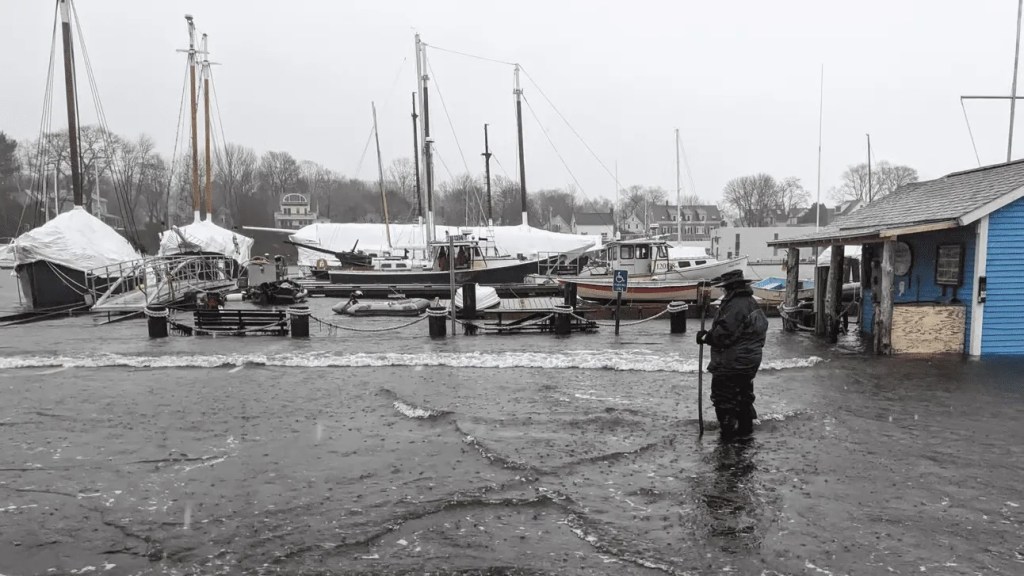 Susan Manning stands ankle-deep in the tide in a flooded parking lot in Camden as she keeps an eye on her boat, the Hopeful Outlook, far left, about an hour after high tide during a Jan. 13, 2024, storm. (Annie Ropeik/Maine Monitor)