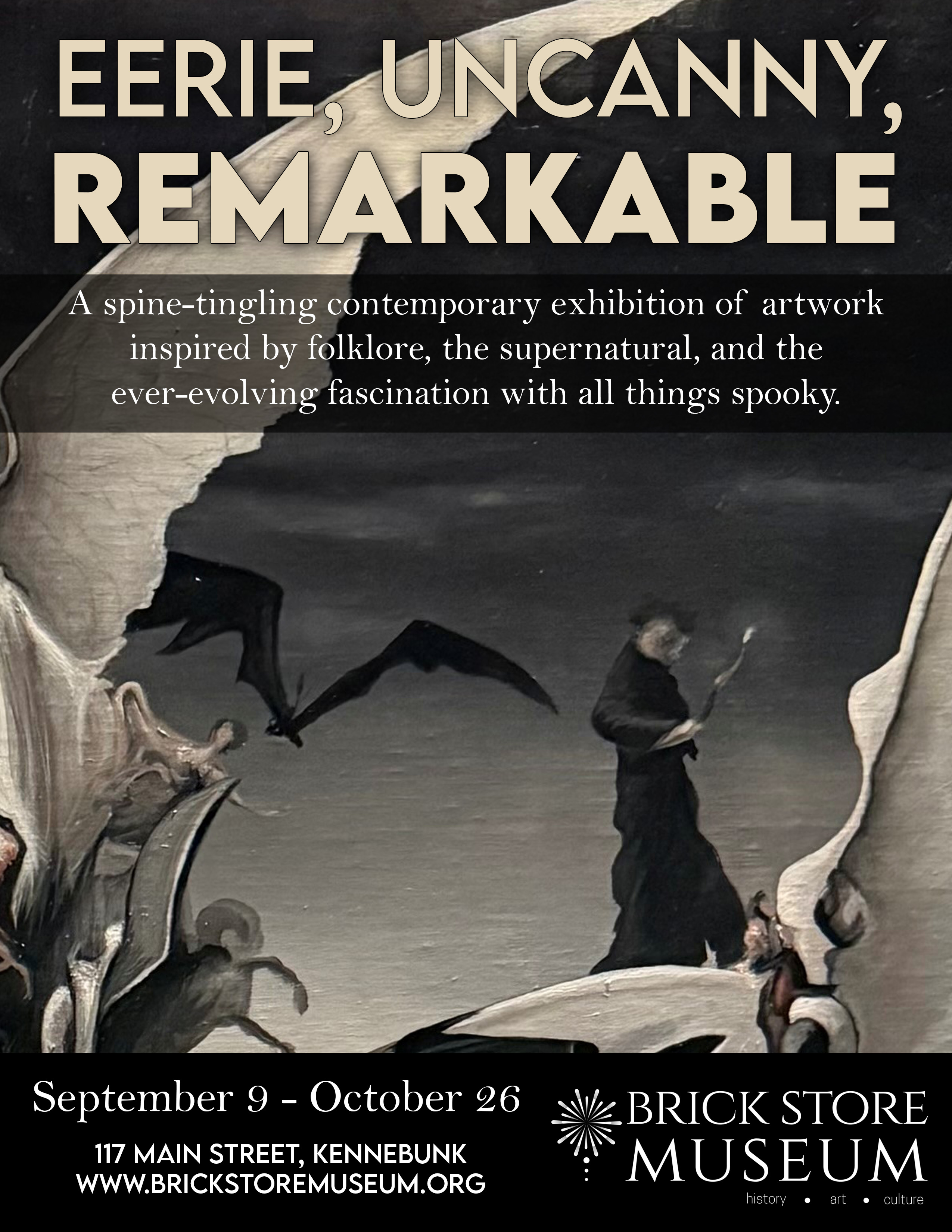 The Brick Store Museum announced the opening of “Eerie, Uncanny, Remarkable” in the Patsy Bauman Gallery, a contemporary art exhibition inviting regional artists to explore what the 19th century called phantasmagoria. The fall showcase, timed for the Halloween season, is open Sept. 9 through Oct. 26.