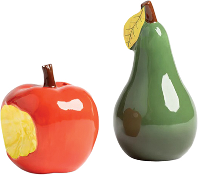 A bitten dolomite apple is matched with a glossy pear to shake up the table setting. 2.5 to 4 inches high and 2 inches in diameter.
