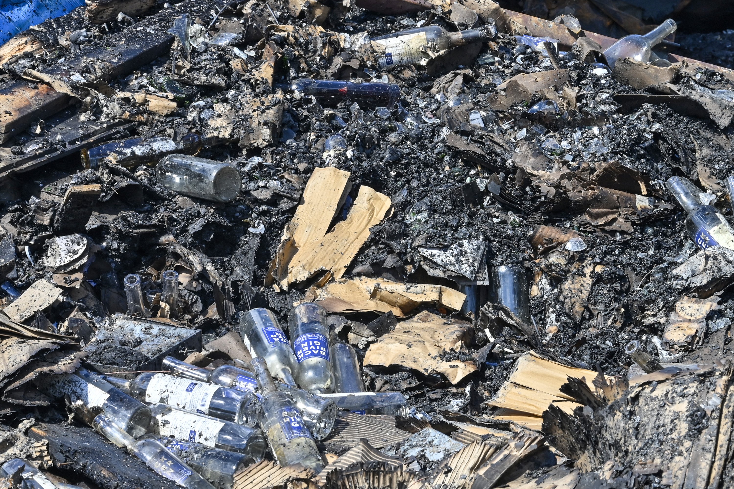 Monday the charred remains of what was left of the demolished building were stacked in a large, black pile on the hilltop property. Bottles and booze-making equipment were visible among the rubble.