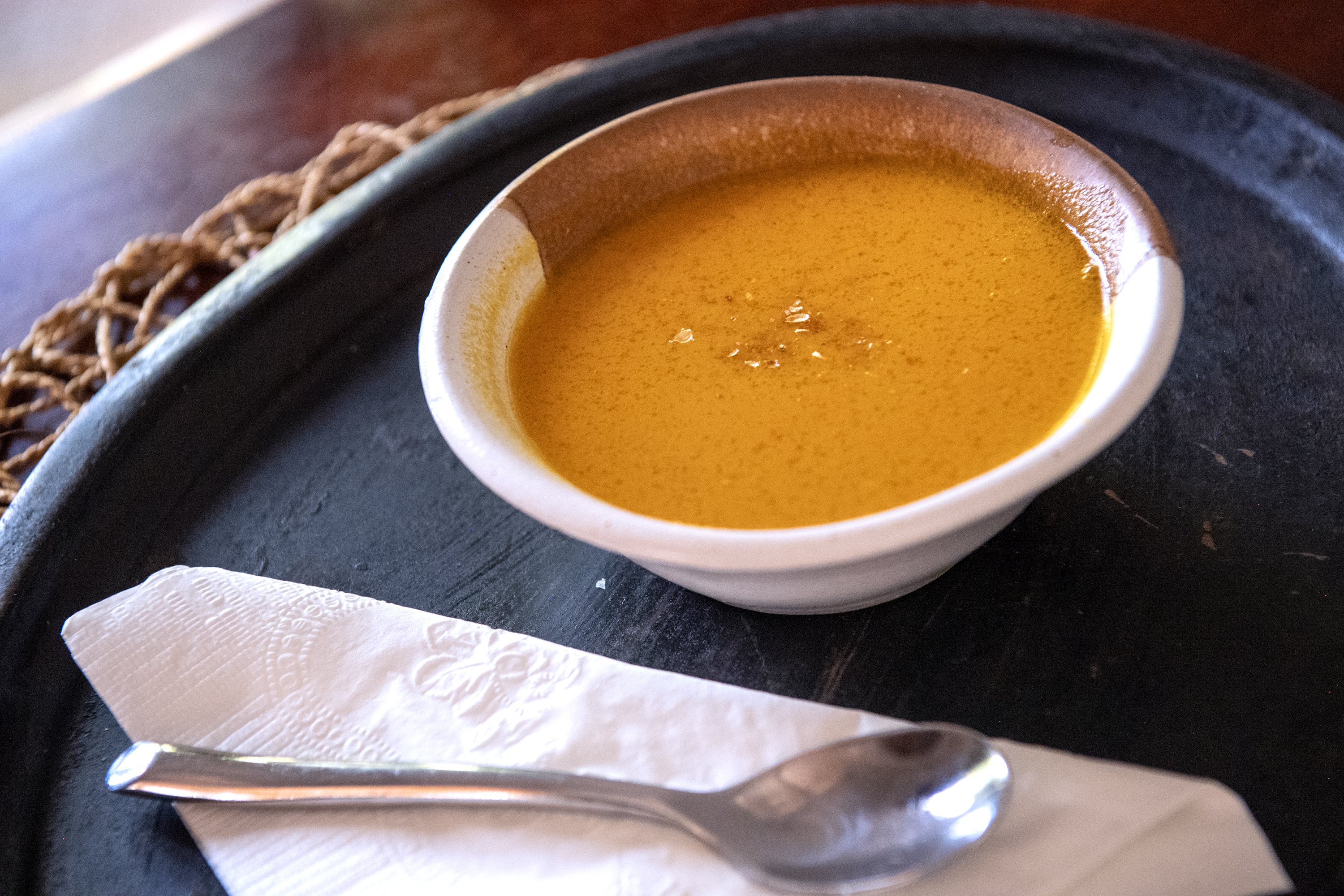 Combine the aromatics, spices and 2 tablespoons of olive oil in a large pot. Place the pan over low heat and allow the ingredients to soften while the vegetables roast. When the vegetables are roasted, add them to the pot along with 1 cup of the stock. Transfer the mixture to a blender and process until smooth. If the mixture is too thick and your blender stutters, add the other ½ cup of broth.