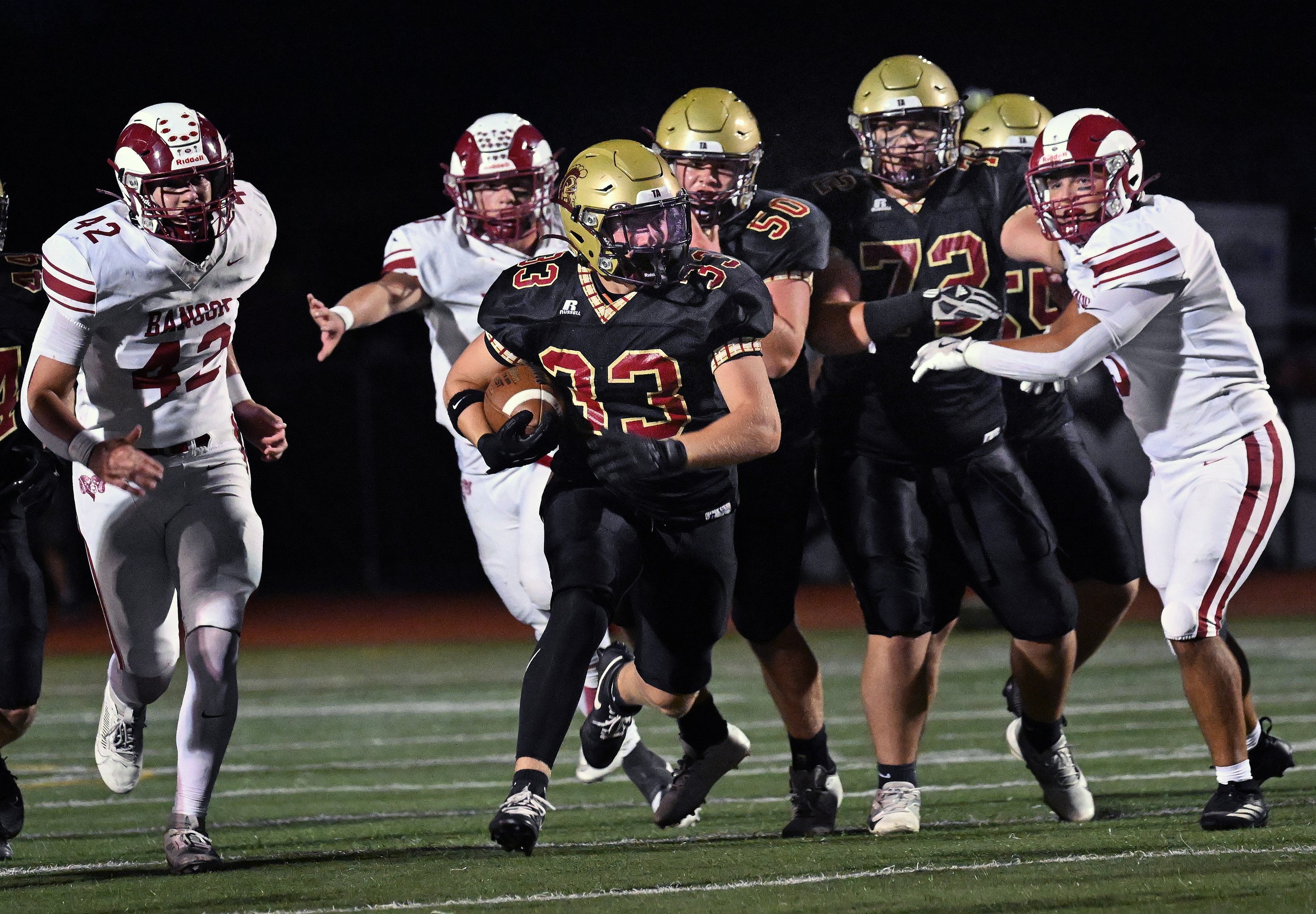 Greely and Falmouth’s rivalry game has a nickname (The Battle of Route 9) and a trophy. But since 2018, when Falmouth beat Greely 21-12 in a Class B South regular-season finale, the trophy has been gathering dust in Falmouth. Greely shuttered its standalone program in 2019 because it knew it would have less than 10 players and joined a co-op with Falmouth. When Greely returned to a standalone program in 2022, it played eight-man football. Both programs won their first football state championship last fall – Falmouth in Class B and Greely in eight-man Large School. Now the Rangers are back in 11-man football, playing in Class C, while Falmouth is back in Class B South.