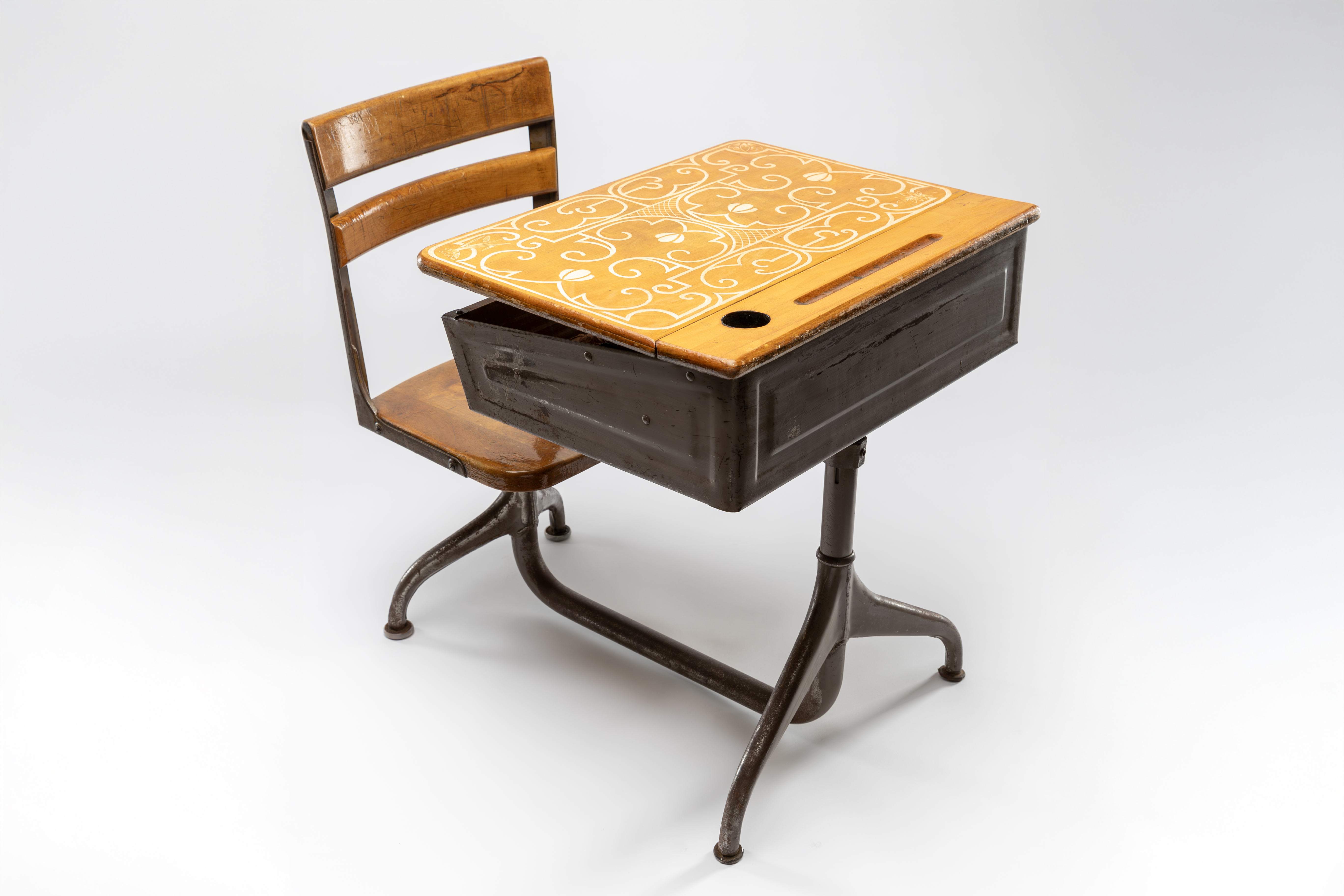 Passamaquoddy artist Gabriel Frey made what appears at first glance to be a familiar school desk. Closer inspection of “Epistemicide” reveals the traditional motif etched into the surface of the wood. The desk is ajar, and inside is a heart, thumping with the sound of an axe on an ash log.