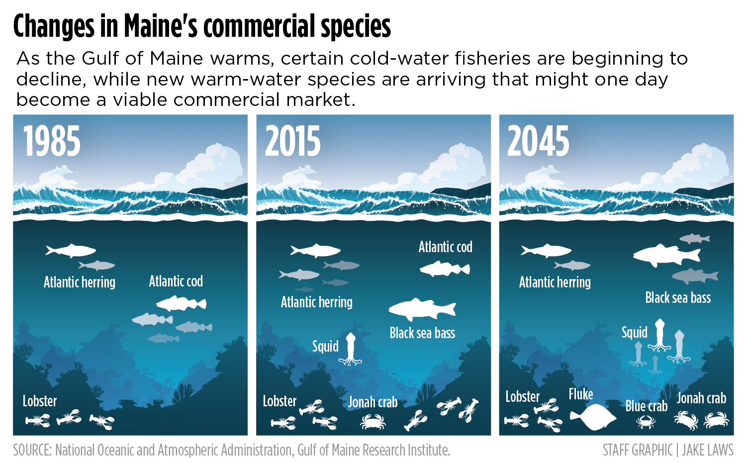 As those numbers decline, can Maine fishermen look forward to replacing lobster losses — as well as herring and cod losses — with any new warm-water commercial fish markets? There are some potential candidates, senior scientist Kathy Mills with Portland’s Gulf of Maine Research Institute said, including black sea bass, long-finned squid, winter flounder and blue crab.
