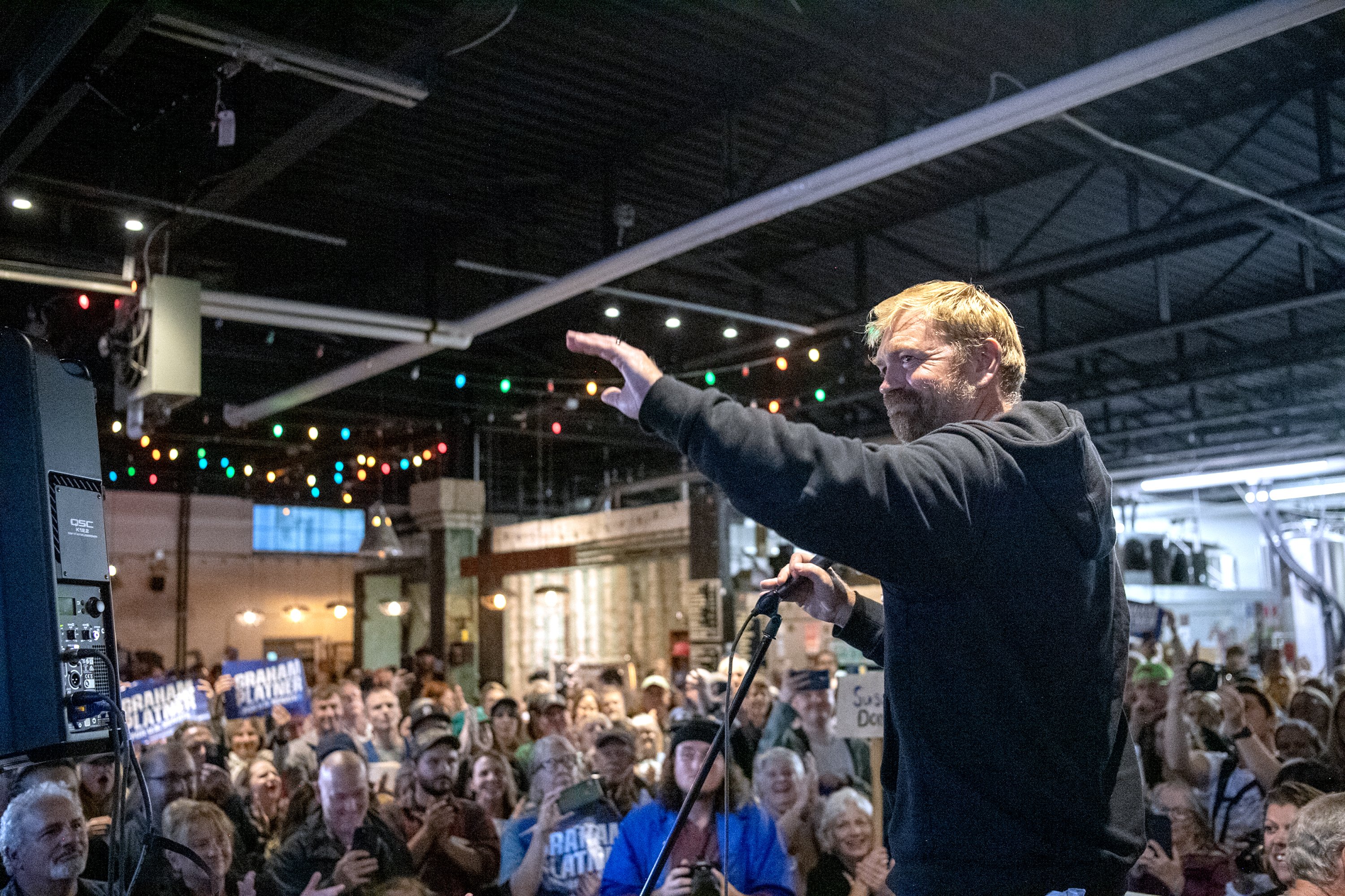 About 1,400 people attended, according to the campaign, which made for a crowded experience as only around half of attendees were able to squeeze into the venue’s indoor space while others stood in a rainy parking lot and listened through the open doors.