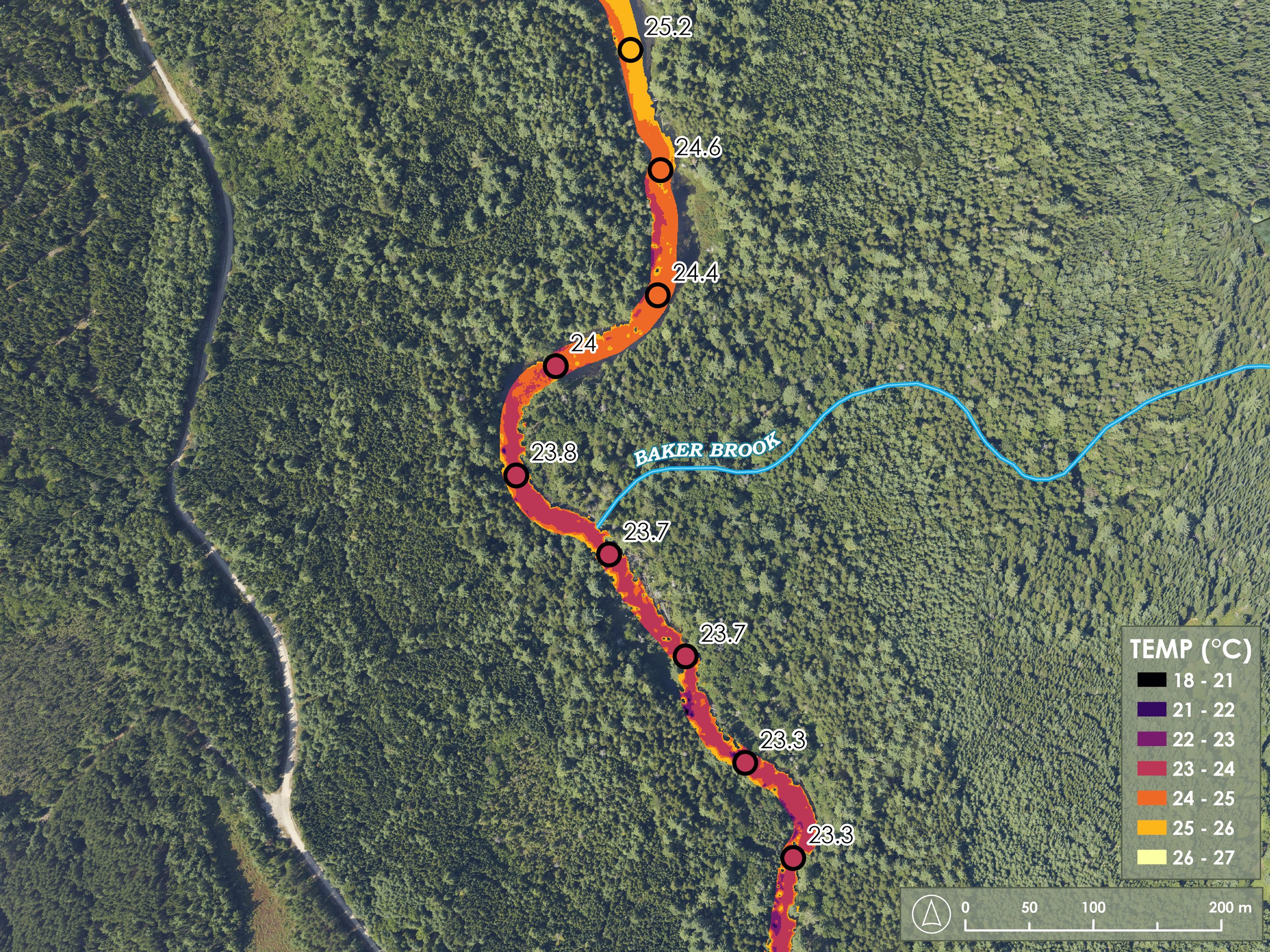 She and the research team conducting thermal mapping of the Narraguagus are still processing their data, trying to determine the farthest a salmon will swim between cold spots, but they have already started sharing some with conservation groups.