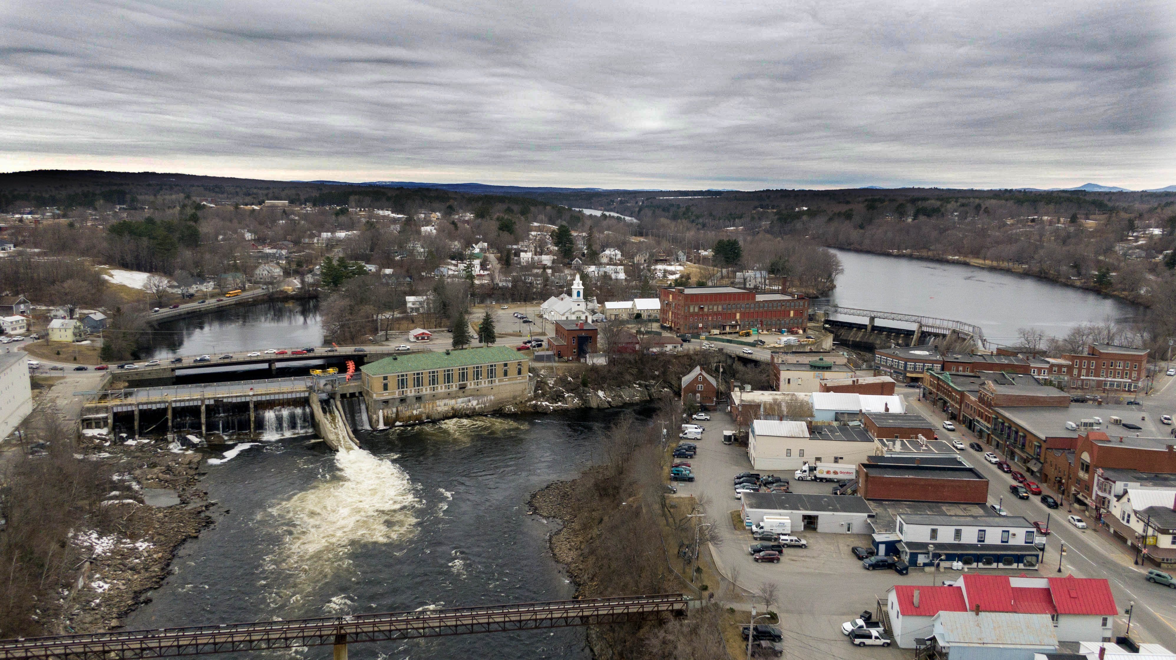 The Weston Station Dam releases water into the Kennebec River on April 5, 2023, showing Water Street, on the right, in downtown Skowhegan. (Staff Photo by Michael G. Seamans/Staff Photographer)