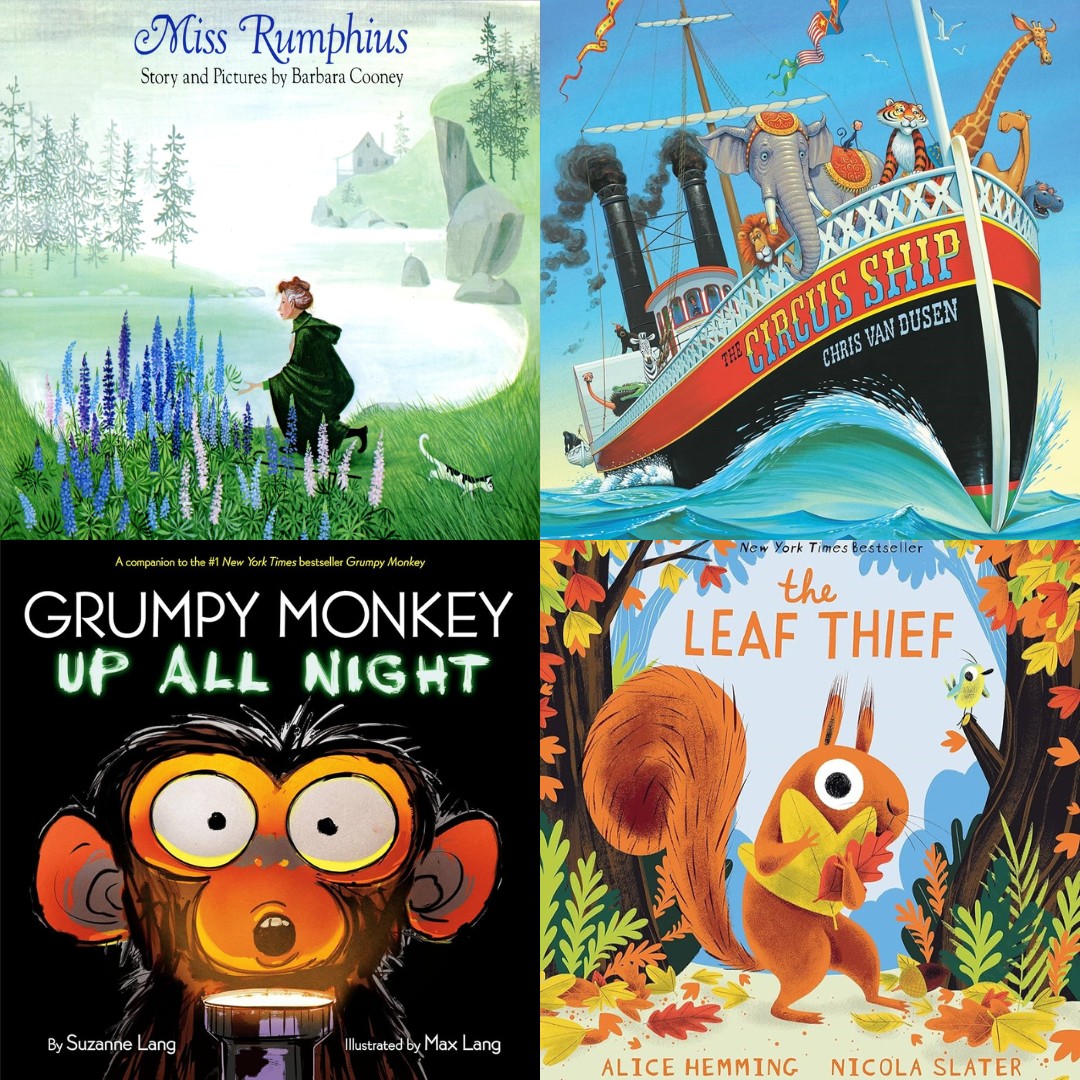The four books that will be performed at the Readers Theater event on Oct. 4 (clockwise from top left): “Miss Rumphius” by Barbara Cooney, “The Circus Ship” by Chris Van Dusen, “The Leaf Thief” by Alice Hemming and Nicola Slater, and “Grumpy Monkey Up All Night” by Suzanne Lang. (Courtesy of Midcoast Literacy)