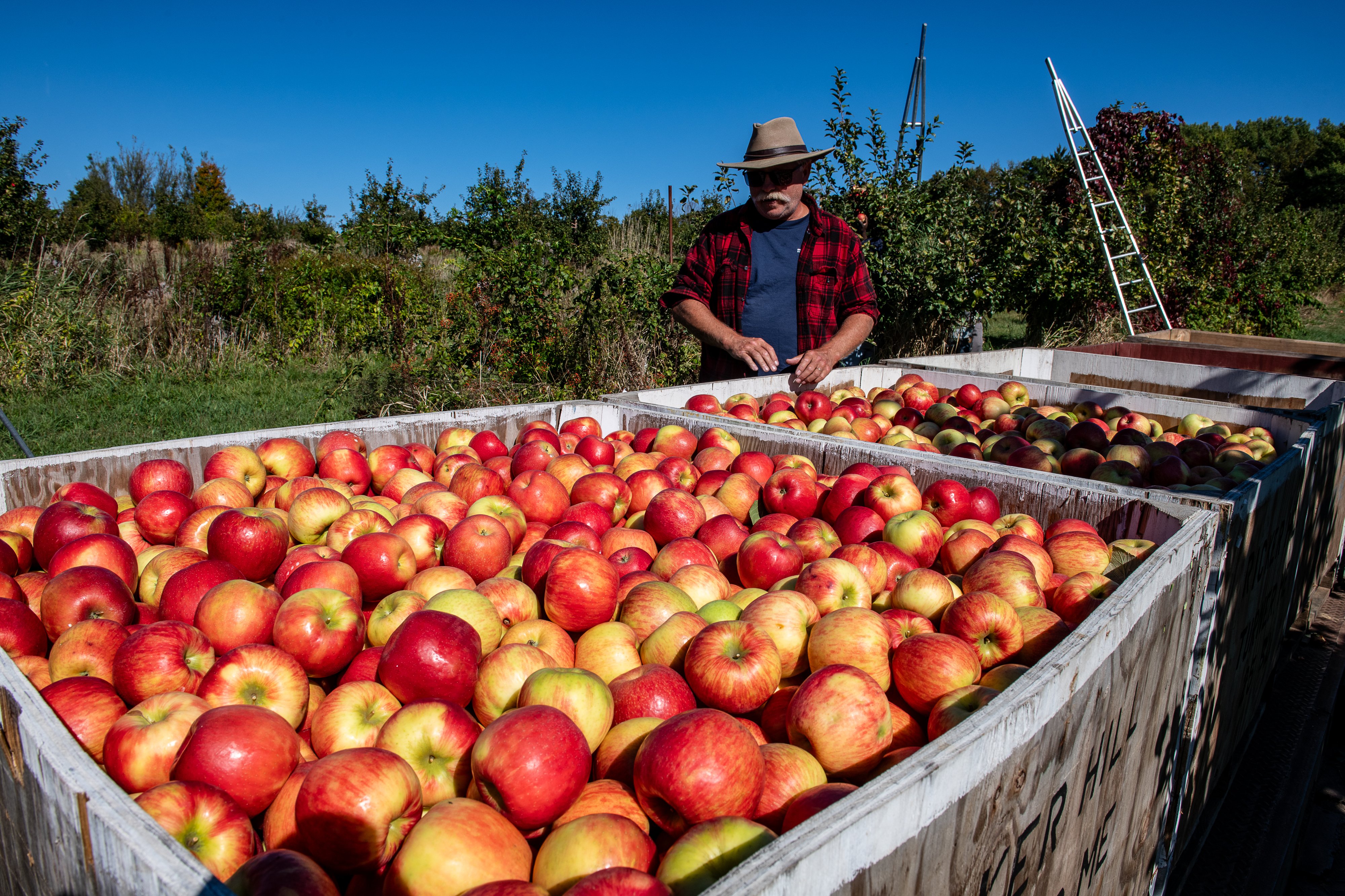 Crew boss Jay Lambert checks out the Honeycrisp apples in a harvest bin Thursday afternoon at Highmoor Farm in Monmouth. (Russ Dillingham/Staff Photographer)