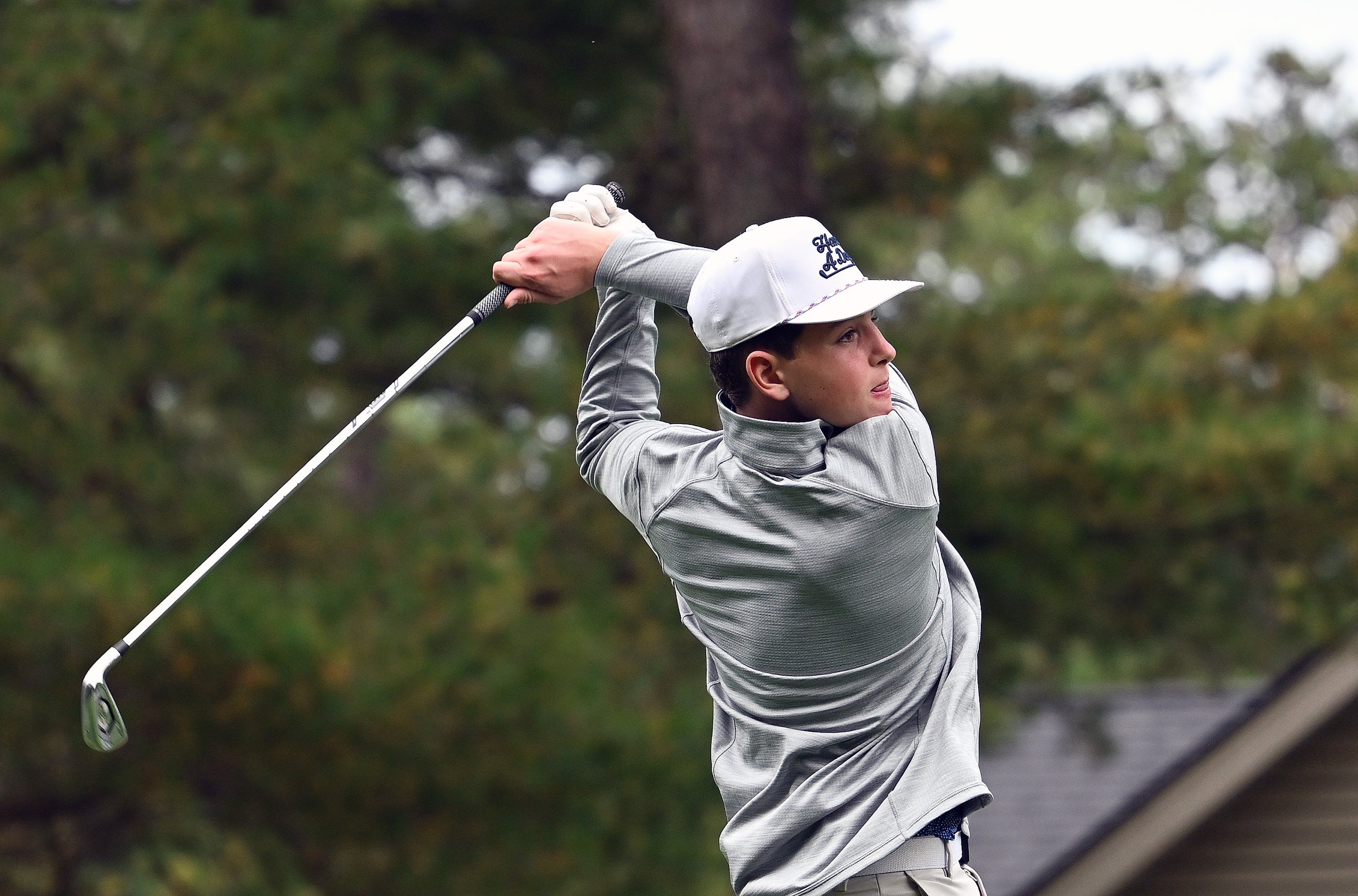 Yarmouth’s Gabe Janczuk tees off in September 2024 at Dunegrass. His 82 on Monday helped the Clippers win the WMC qualifier and earn a berth into the Class B state championship. (Shawn Patrick Ouellette/Staff Photographer)